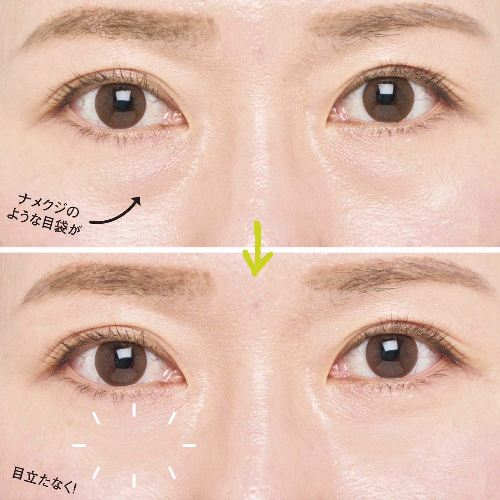 気になる目袋のふくらみがフラットに。塗布した部分が目立たず自然な仕上がり