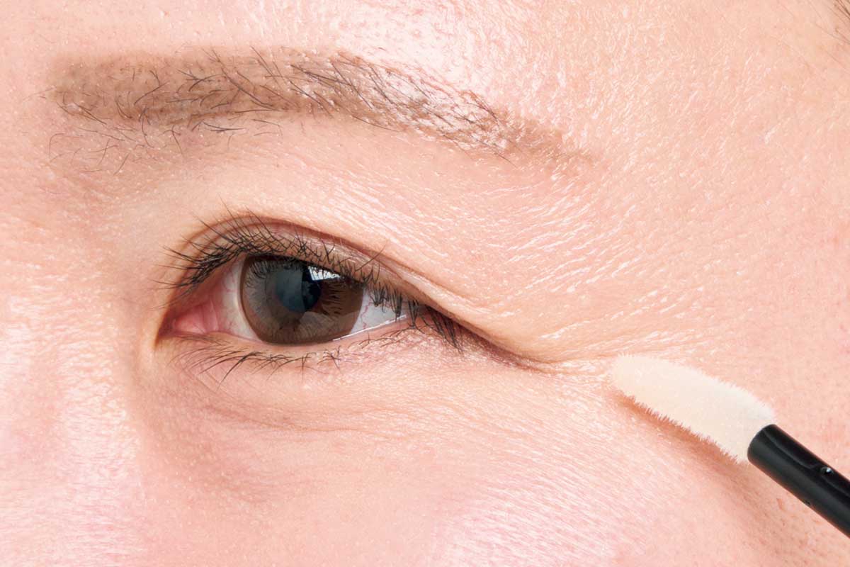 目袋の気になる部分に凸凹をぼかすスムースタイプの下地を仕込んで。筆で塗ると均一に伸ばせます。その後透明感のあるコンシーラーで光をオン。さらにルースタイプのパウダーで押さえて仕上げます。