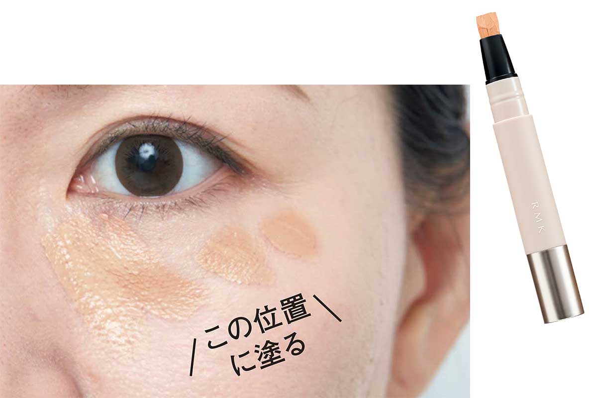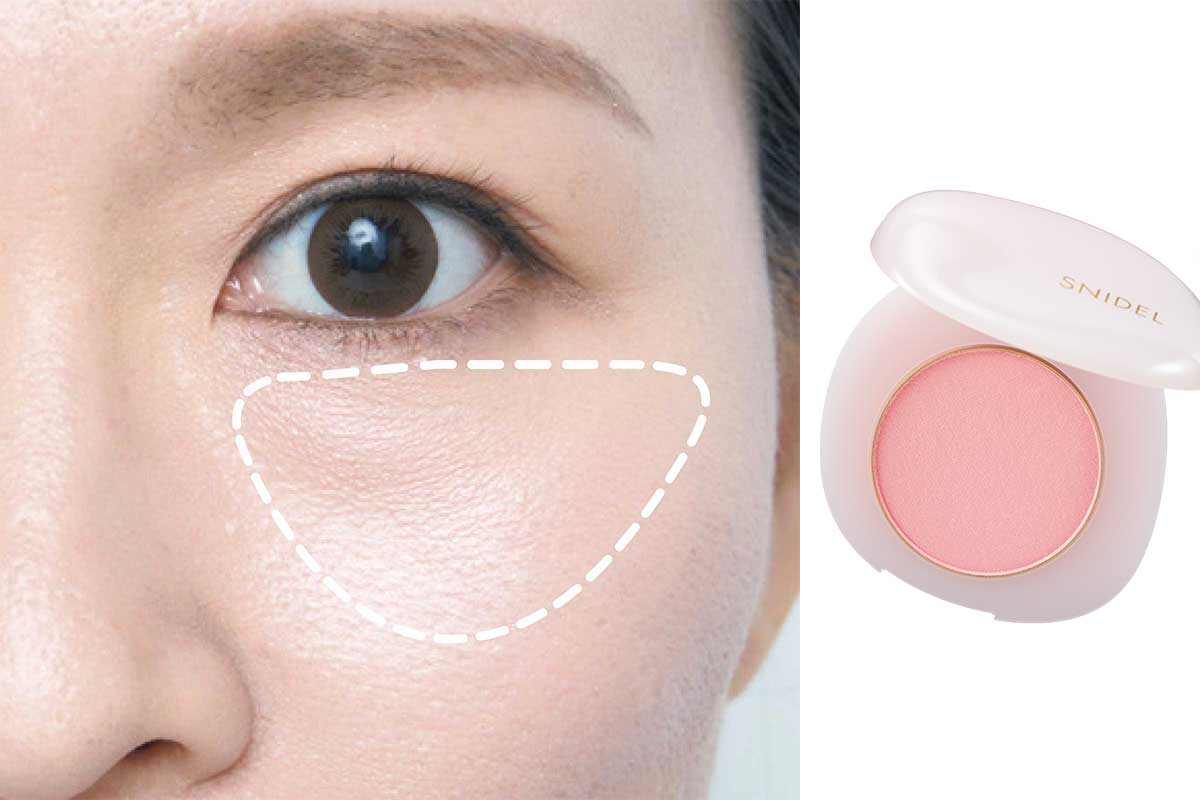 気になる目袋の周囲に透明感のある明るいチークカラーを。皮膚が薄い目の下にファンデやコンシーラーを厚ぼったく重ねるよりチークカラーでカバーして。
