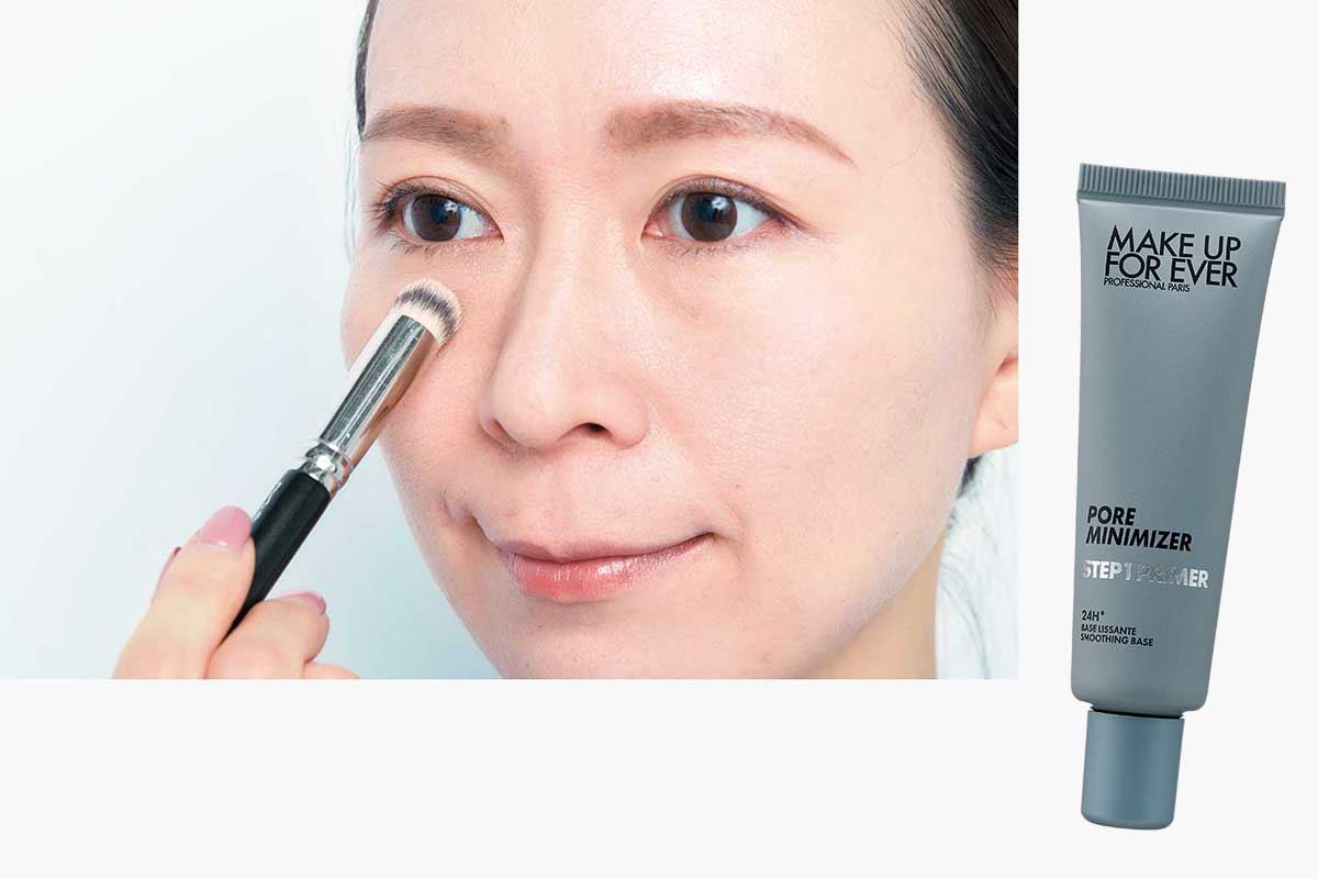 目の下のお悩みはがっつりコンシーラーでカバーするテクをよく見かけますが、進化系下地でカバーするのが◎。毛穴用のスムースタイプの下地には凸凹をフラットにする効果が。ベースは薄く、チークで華やかさをプラスするのがコツ。