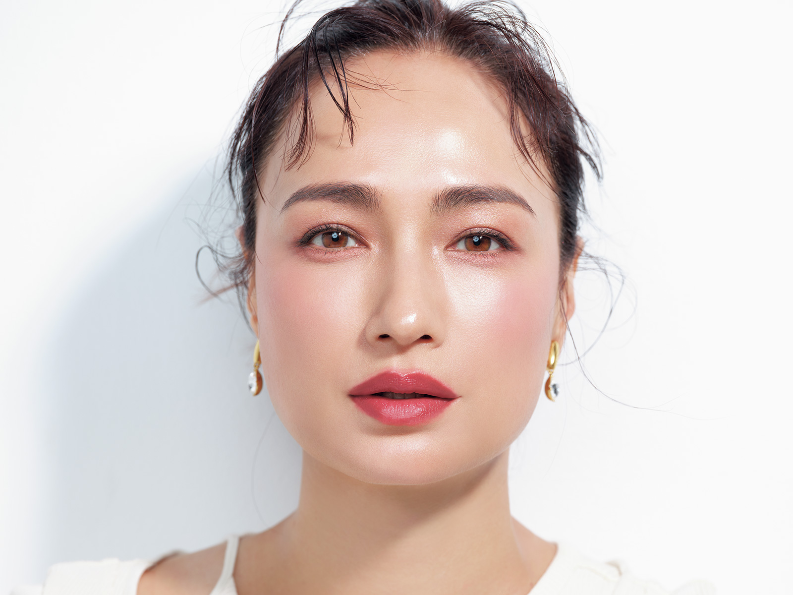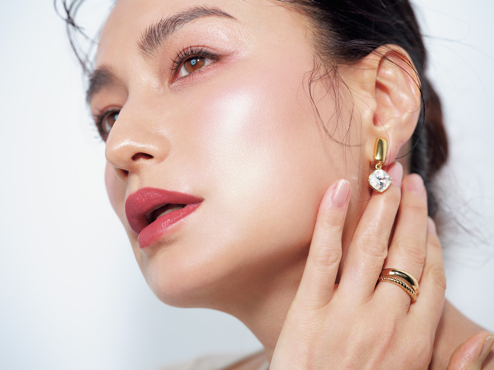 SUQQUのリキッドファンデは、毎回現場で使っているほどお気に入り。コンシーラーがいらないくらい肌を均一に整えてくれるカバー力はあるのに、軽いつけ心地で、みずみずしくツヤやかに仕上がります。肌のヘルシーな質感に合わせて、コーラル寄りのピンクを目元・チーク・リップに入れてワントーンにすると多幸感がアップ。肌のツヤを引き立たせるため、お粉はヨレやすい部分にだけ塗り、リップはセミマットで落ち着かせます。