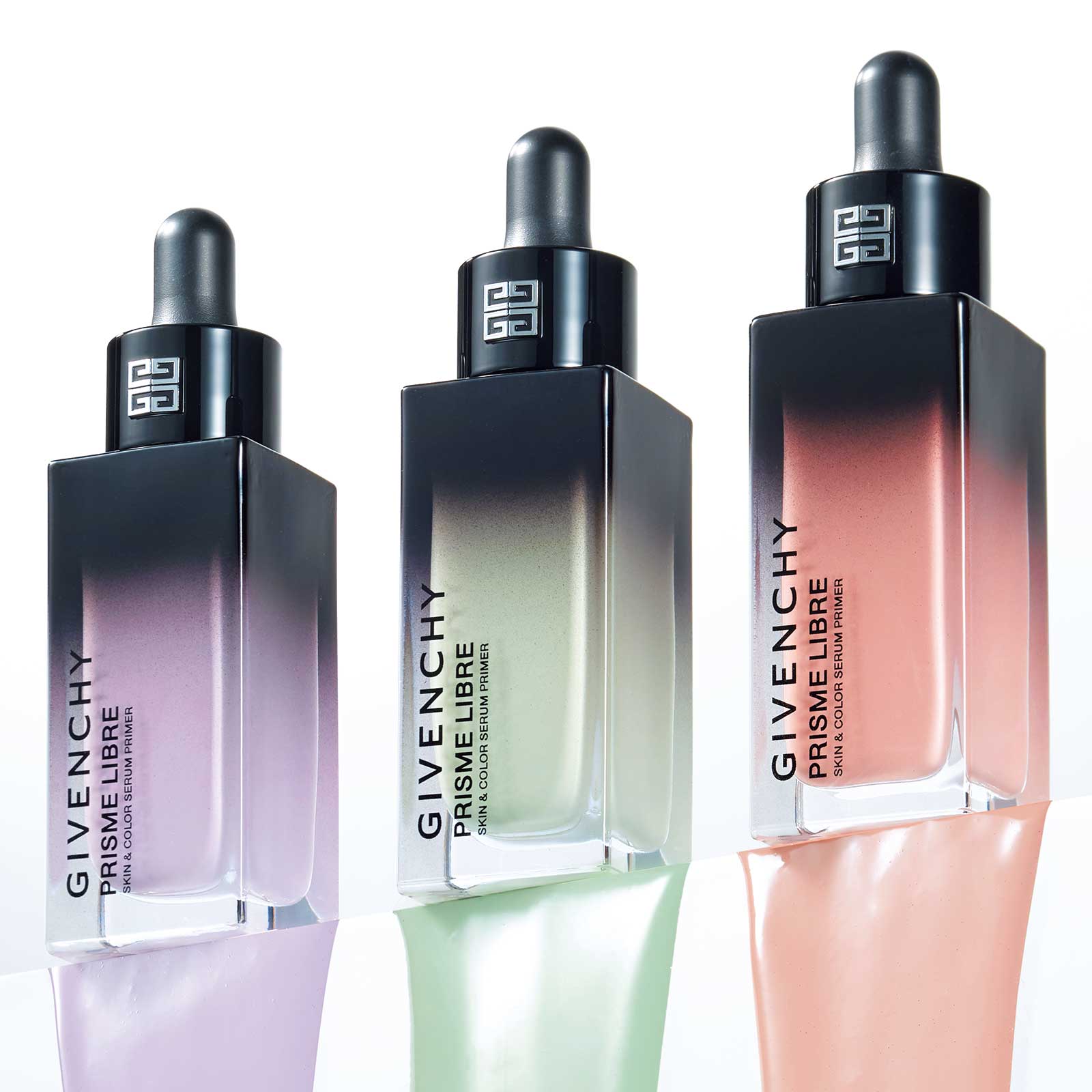 2週間使い続け、素肌の変化を検証!カラーごとに悩みに特化した成分を配合し、均一な肌トーンに導く。下地としてだけでなく、夜のスキンケアの最後にも使用可能。左からパープル、グリーン、ピンク 30ml 各¥7,700(パルファム ジバンシイ)