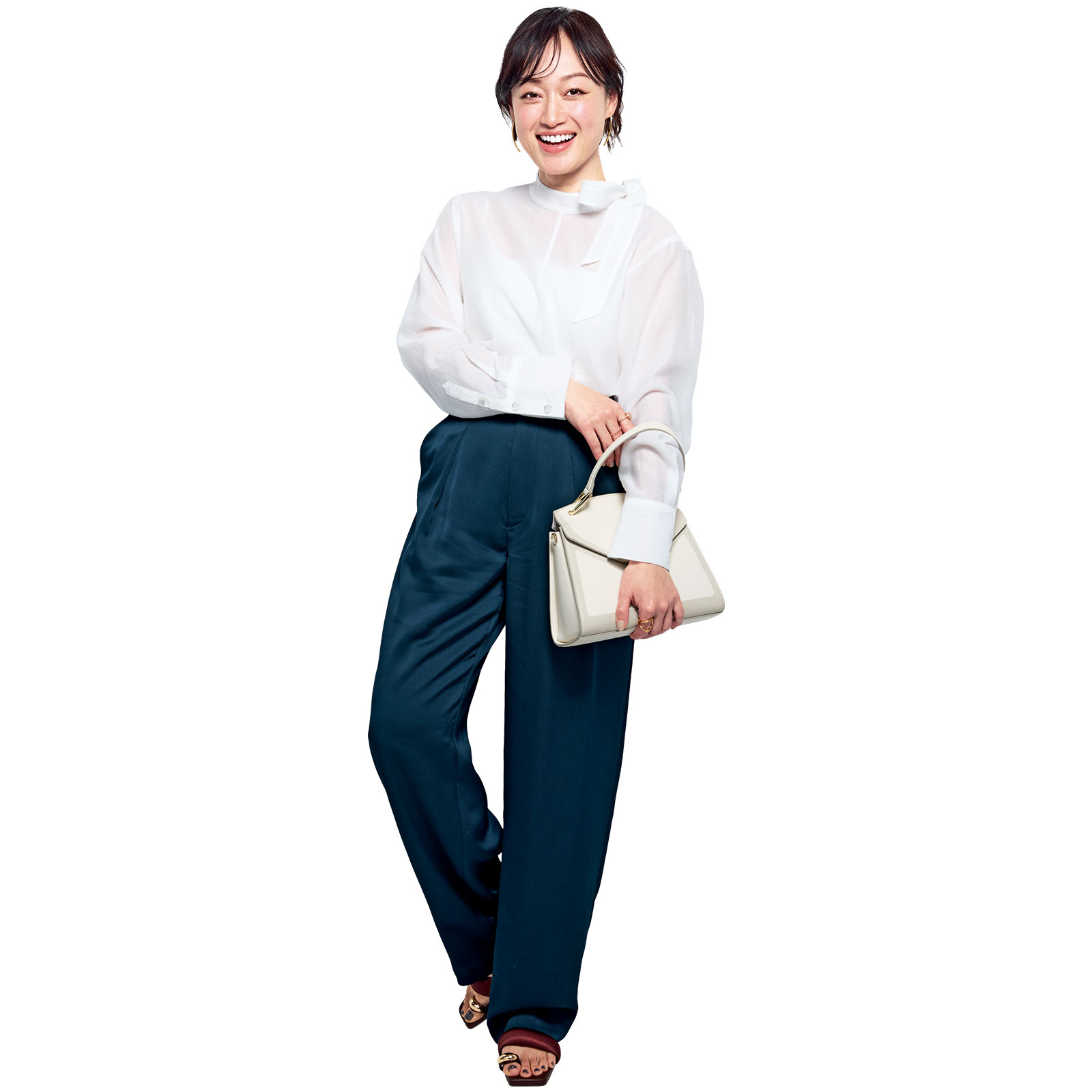 〈衣装クレジット〉ブラウス¥15,400〈ルージュ・ヴィフ アンナ〉バッグ¥29,700〈ロウェル シングス〉サンダル¥23,100〈オゥ バニスター〉(すべてアバハウスインターナショナル オンラインストア)パンツ¥46,200(デザインワークス/デザインワークス 六本木ヒルズ店)ピアス¥32,560(左手)リング¥34,980(ともにソコ/ZUTTOHOLIC)(右手)人差し指リング¥328,900(右手)中指リング¥61,600〜(ともにマリハ)
