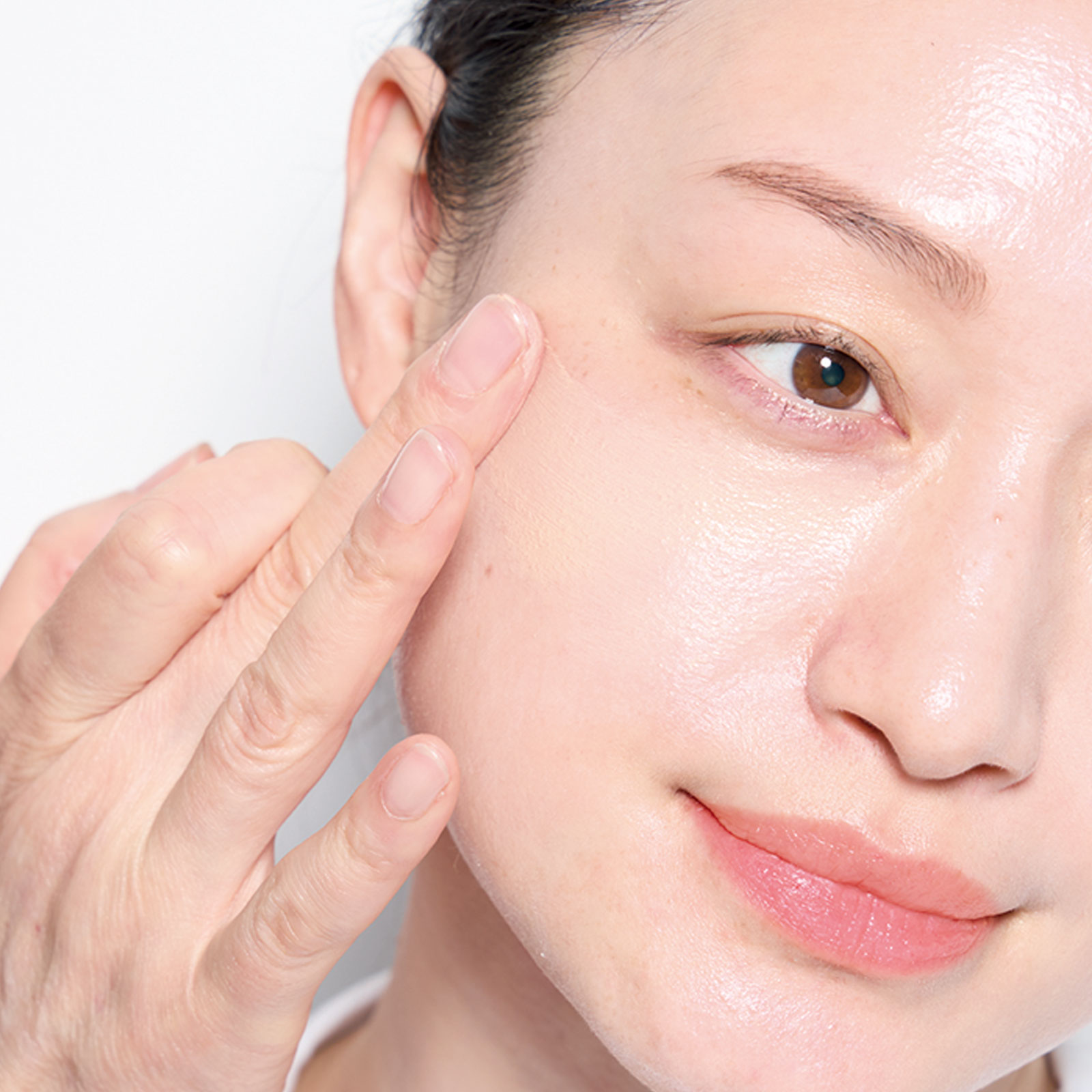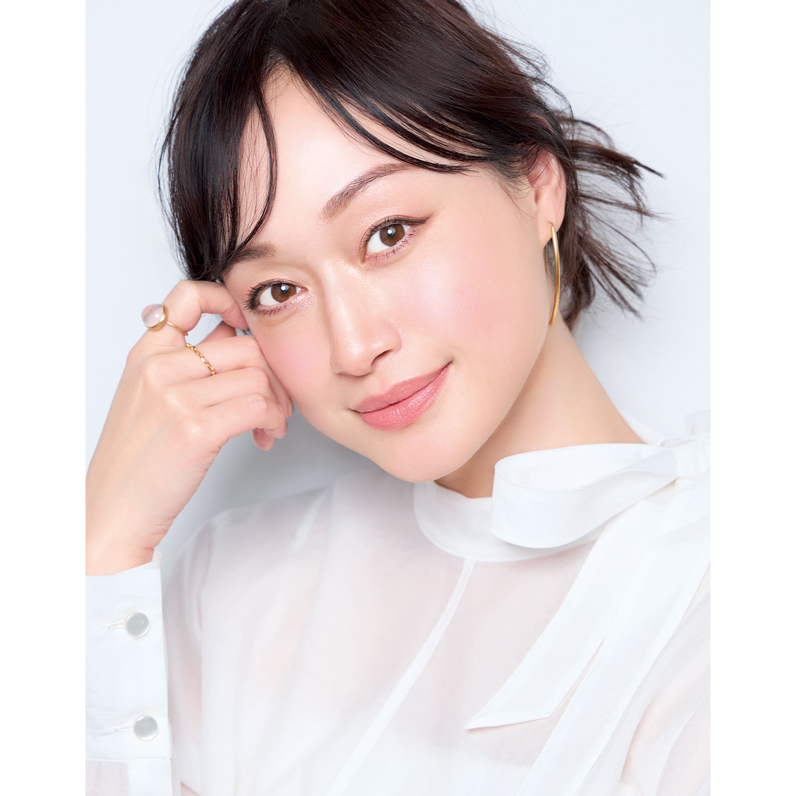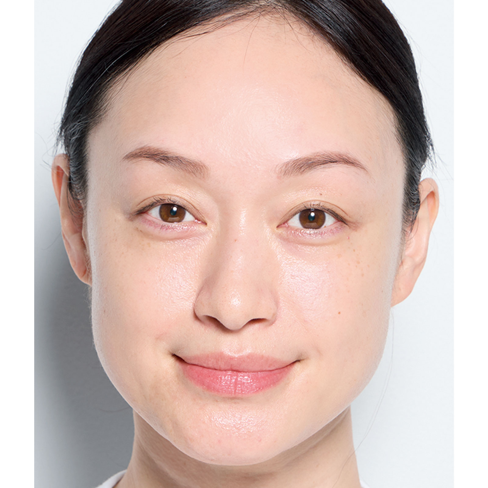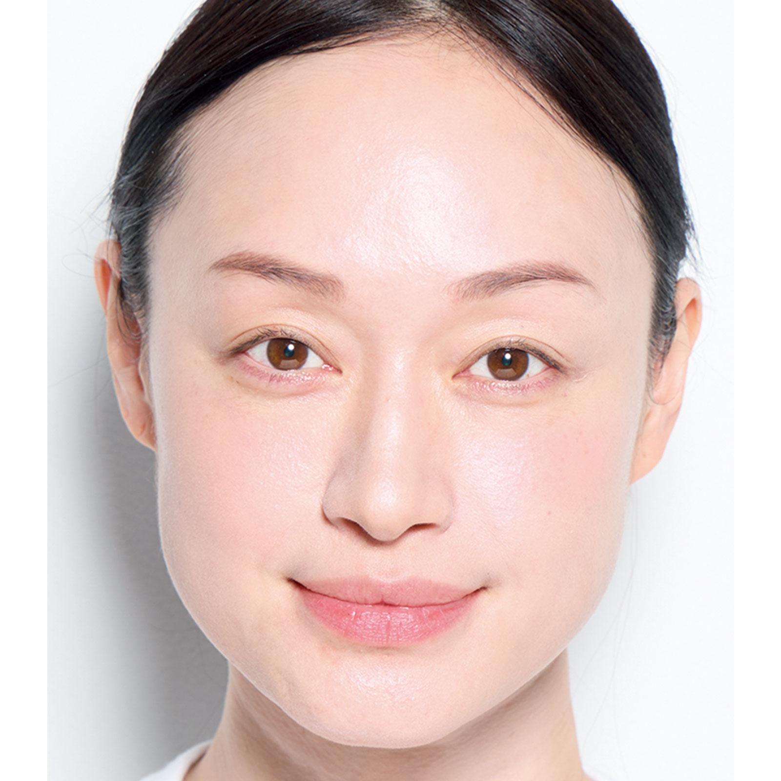 季節の変わり目は肌がゆらぎやすく、くすみも気になるというモデルの田中さん。極薄く少量を重ねながら丁寧に馴染ませたベースメイクで、素肌まで整ったかのような透明感と生き生きとした表情を引き出しました。