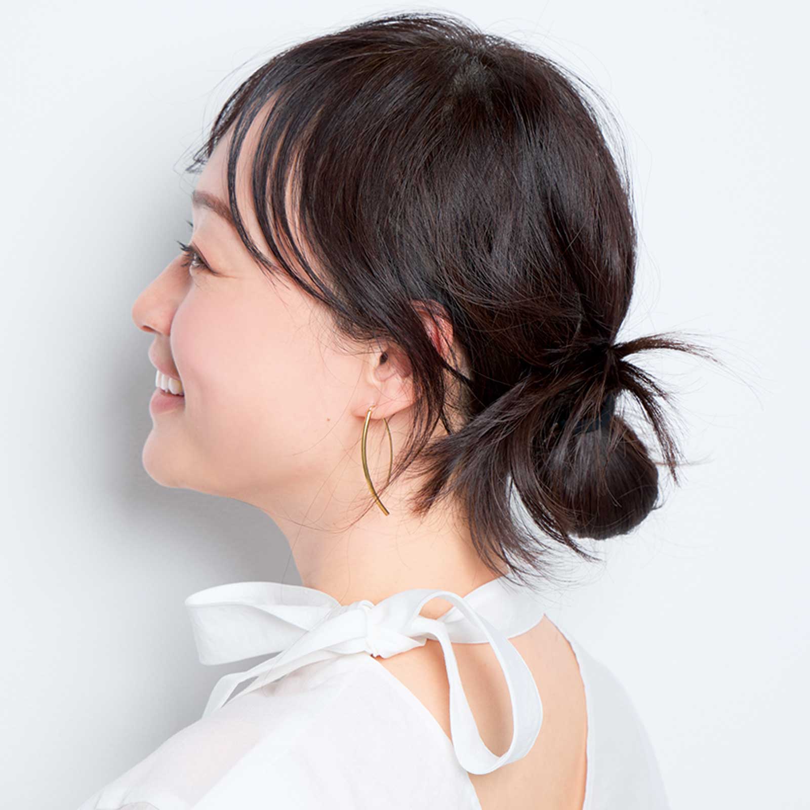肌がのぞくブラウスにはまとめ髪がおすすめ。ランダムに巻いてニュアンスをつけてから、ざっくりとまとめて、毛先も無造作に散らして抜け感を。上品にさりげなく女性らしさも強調!