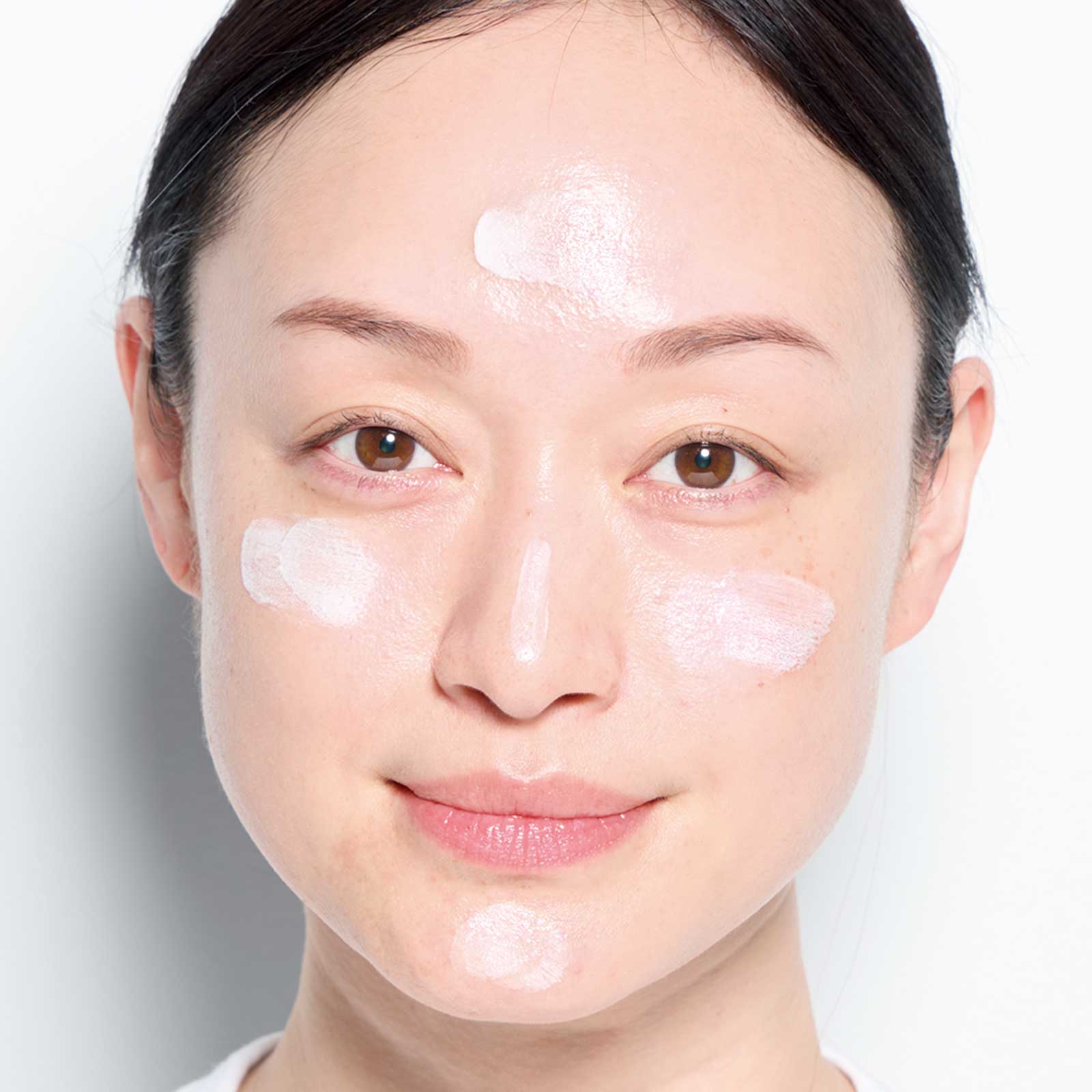 パープル系のベースはくすみを飛ばして透明感を上げてくれます。頰・額・あご先・鼻先の順に置き、中心から外側へ丁寧に伸ばします。明るさを出したい部分に厚みを。首まで薄く馴染ませると、白浮きせずフェイスラインとの境目も自然に。イドル スキン ミルク プライマー #02 ベリー シェイク 30ml¥5,940(ランコム)