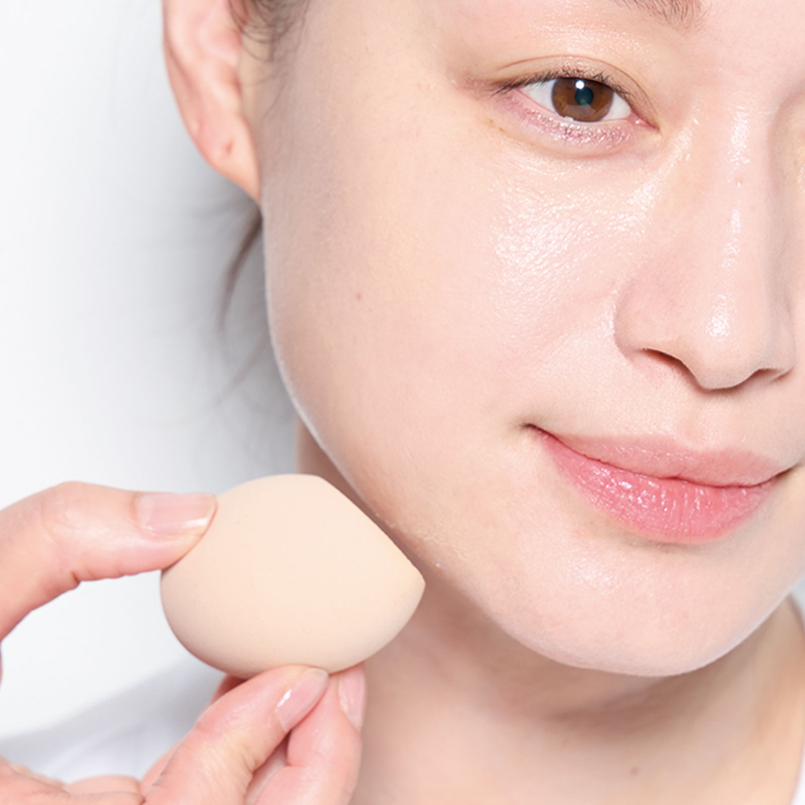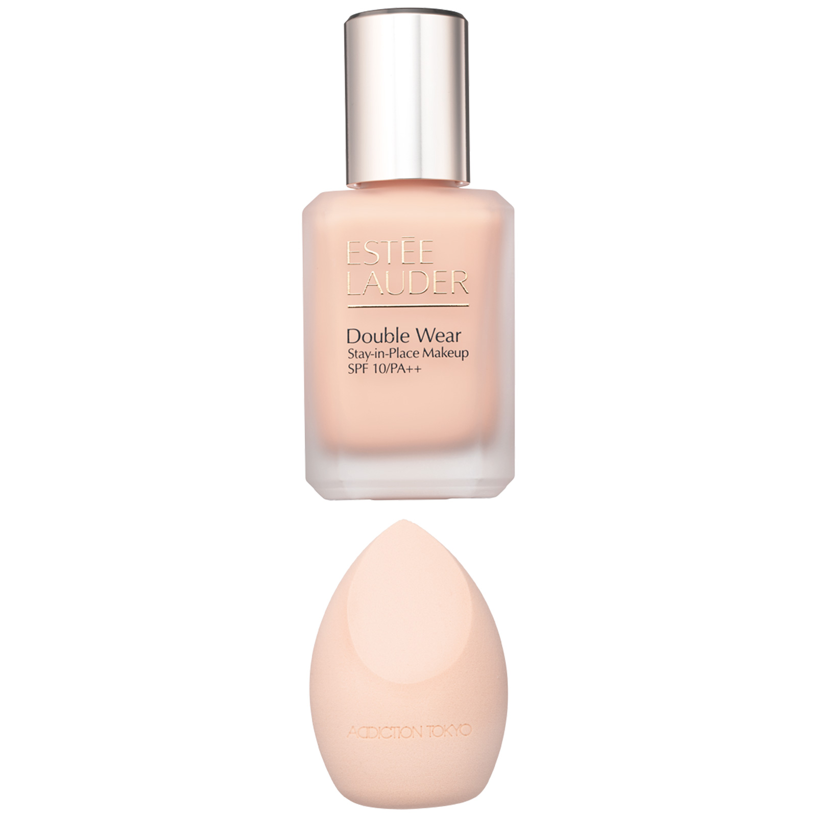 ①ファンデも頰の広い面の“三角ゾーン”から塗り始め、内側から外側へ伸ばします。少量を丁寧に馴染ませてつけすぎないこと。②小鼻やフェイスラインなど細かい部分はスポンジで馴染ませると仕上がりも美しく。ダブル ウェア ステイ イン プレイス メイクアップ N 1N1 アイボリー ヌード SPF10/PA++ 30ml ¥7,590 (エスティ ローダー)、アディクション メイクアップスポンジ グロウフィックス ¥1,100(アディクション ビューティ)