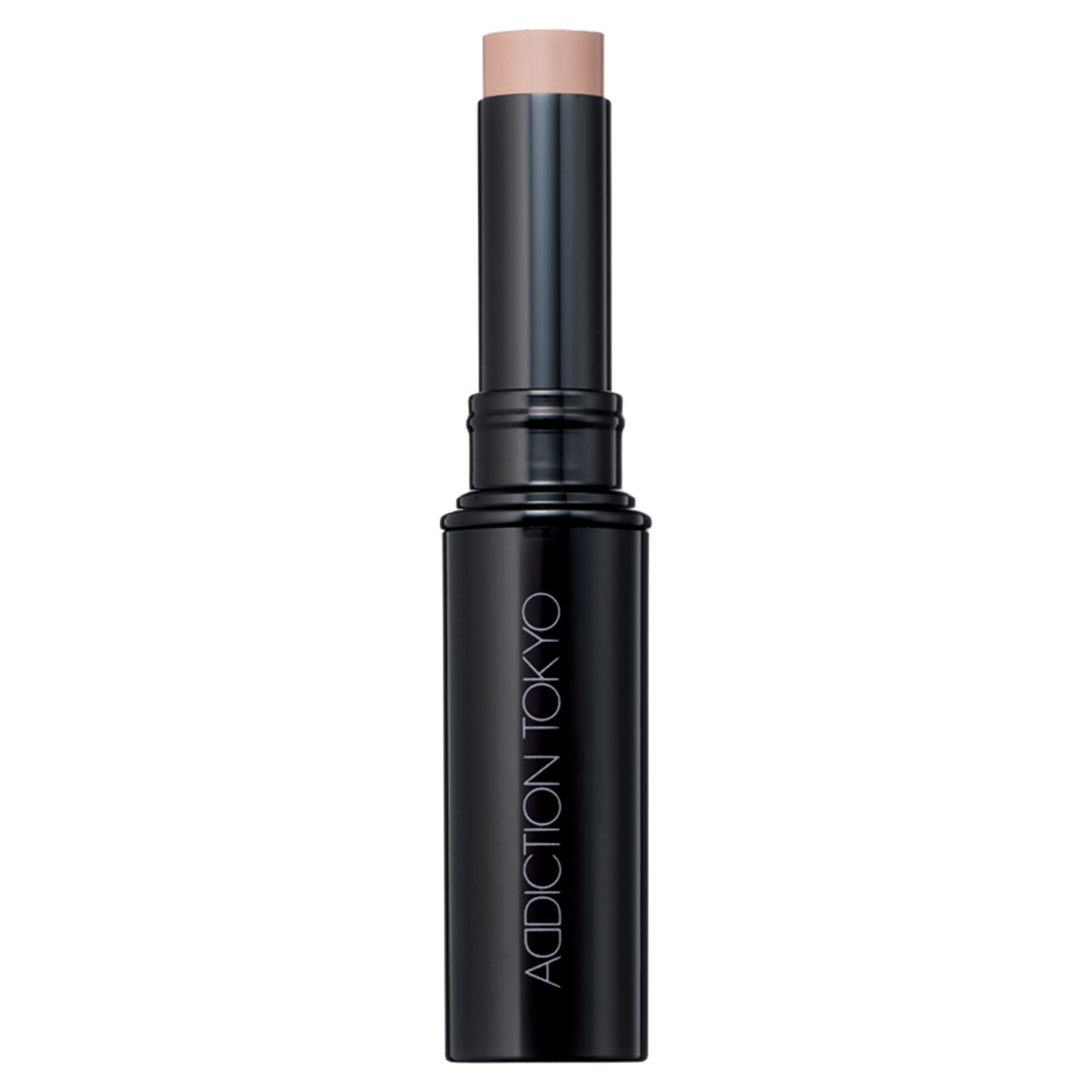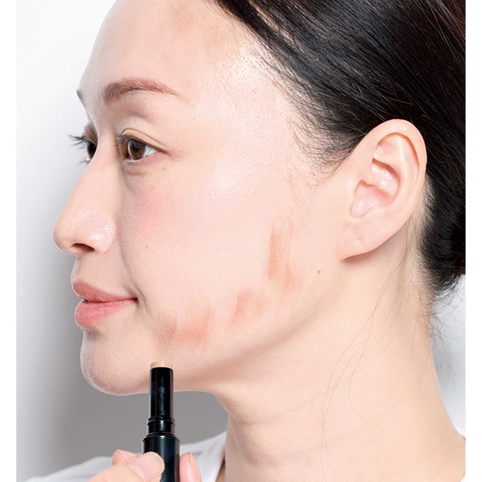 肌に溶け込む影色を顔の側面、エラからあご下、生え際、さらに鼻筋の側面と鼻先にV字を描くように、スティックで大胆に入れ、ブラシやスポンジでぼかします。内側から外側へと伸ばして、境目を感じさせず自然に仕上げます。アディクション コントゥアスティック ¥3,300※4/24限定発売(アディクション ビューティ)