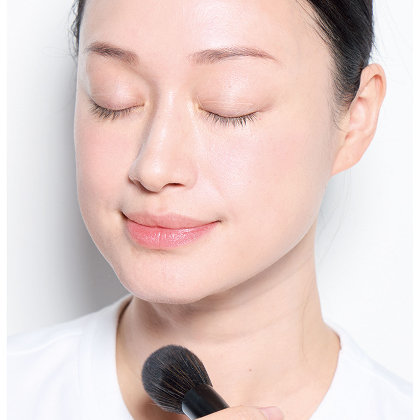 透明感を上げるブルー系パウダーを崩れやすい顔の中心やフェイスラインにかけます。ブラシに残った分を首まで馴染ませて、自然につなげます。ごく軽く仕上げることで、透明感と立体感を損なわないベースに。ケイト ジュレリープカラーパウダー BU 風波 ¥2,310※4/25一部店舗・WEBにて発売〈編集部調べ〉(カネボウ化粧品)