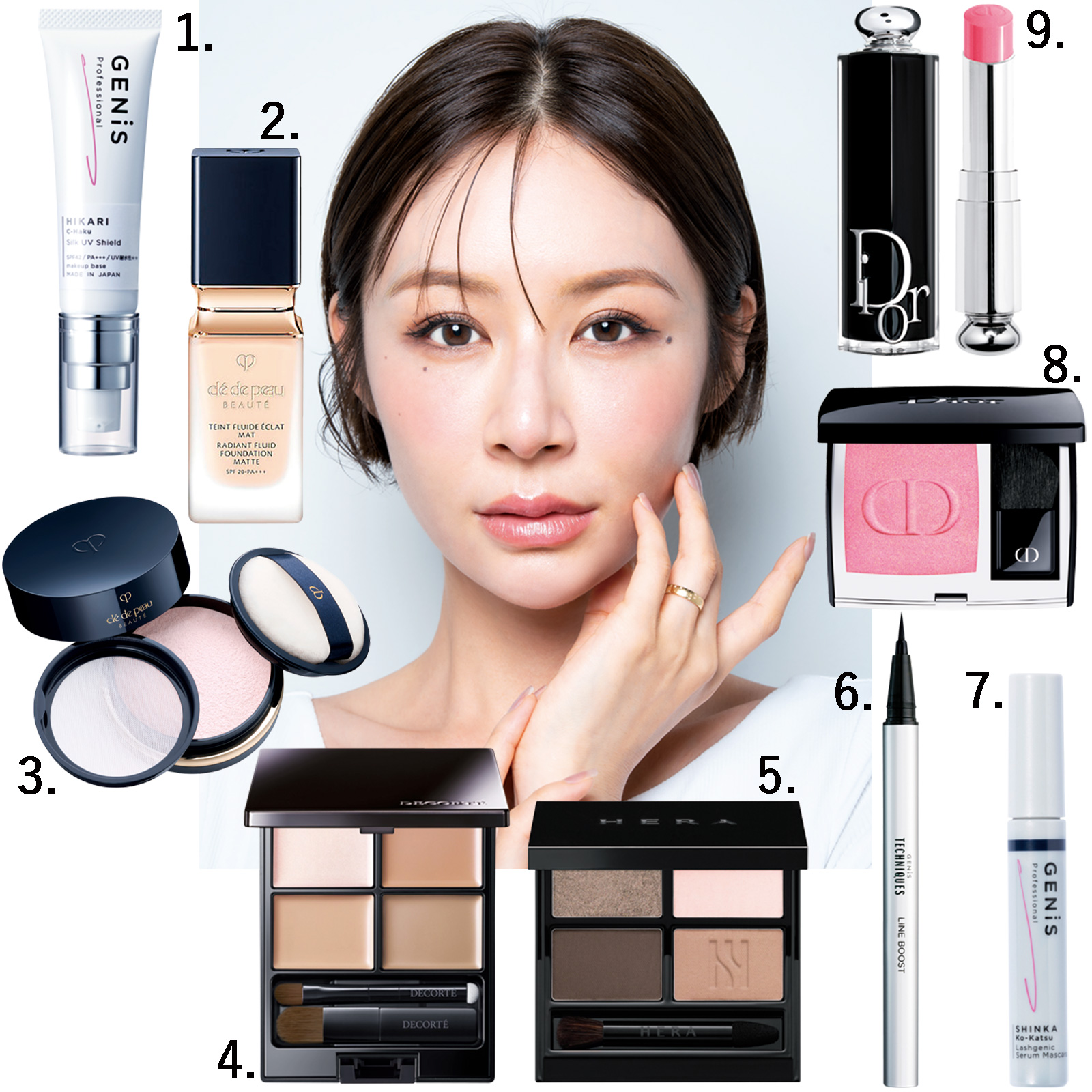 盛るより、立体感と透明感を引き出して整えることにフォーカスしたラインナップ。ベースは1 GENiSのUV下地、2・3 クレ・ド・ポー ボーテのファンデ&お粉で上品なツヤ肌に。肌の粗が気になるところには4 コスメデコルテのコンシーラーを薄くオン。目元は5 HERAのアイシャドウ(3番)の濃いめの色をメインにのせつつ、6 GENiSのブラックアイライナーで引き締め。マスカラも同じく7 GENiSですが、ネイビーを使うことで抜け感のある印象に。チークとリップは、8・9 ディオールのピンク系(どちらも212)でそろえて統一感を。