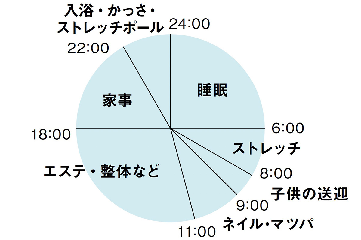 人の手を借りつつ日頃の疲れを整えるスケジュール。夜のストレッチは毎日の習慣で、この時間が自分に戻るスイッチになっています。