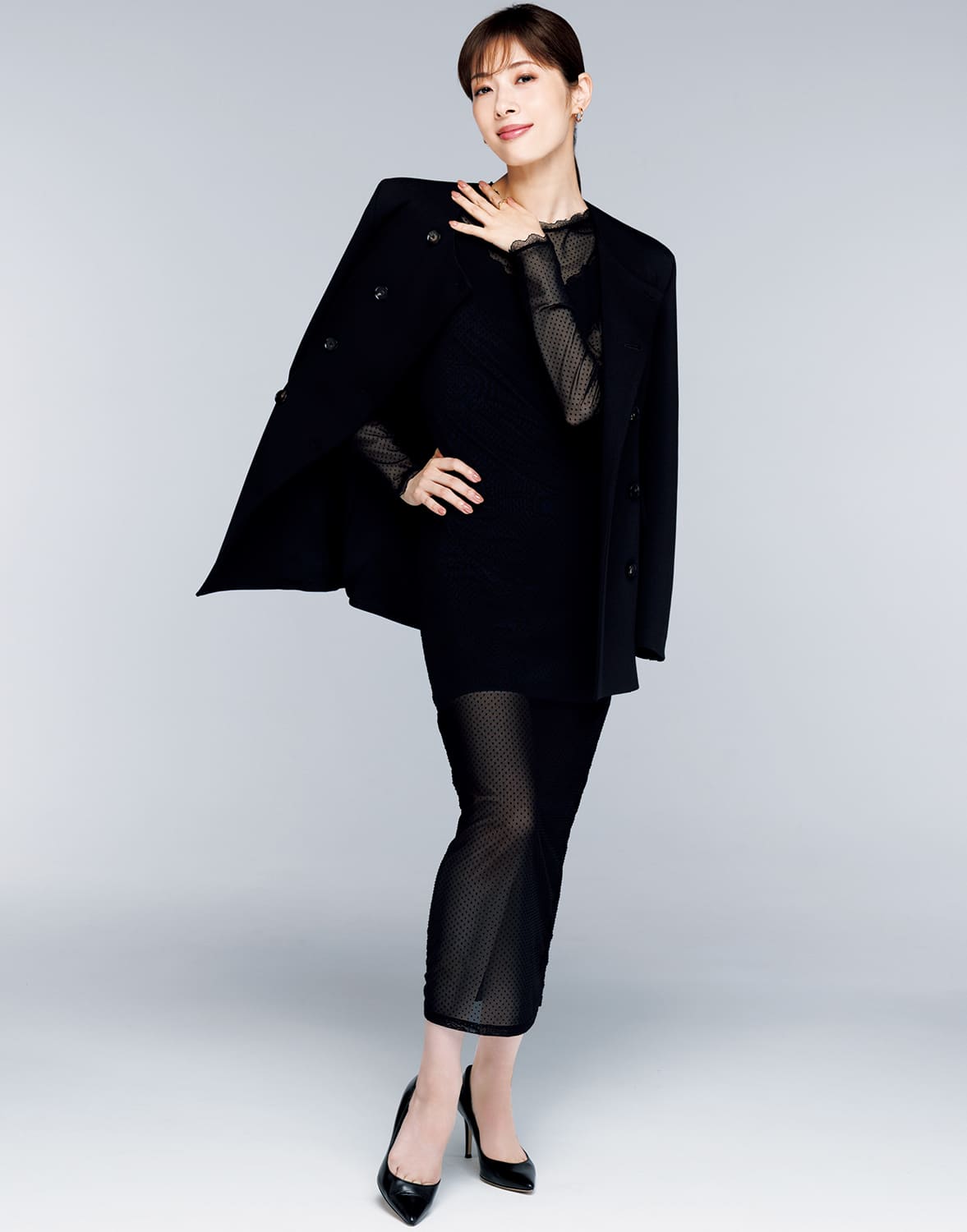 ジャケット ¥121,000(リヴィアナ コンティ/イザ)ワンピース ¥45,100(オールセインツ/オールセインツ ジャパン)イヤリング ¥148,500 リング ¥139,700(ともにヴァンドーム青山/ヴァンドーム青山本店)パンプス/スタイリスト私物