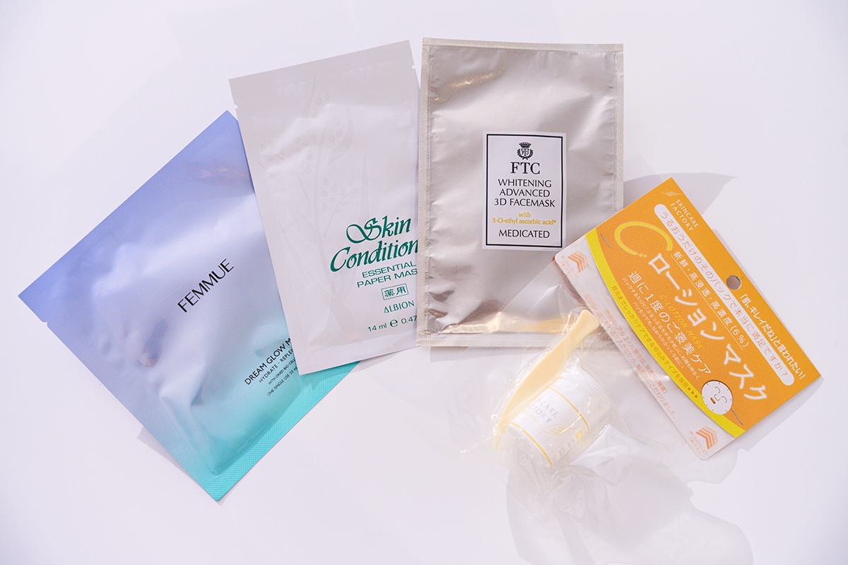 左から:FEMMUEのドリームグロウマスクHRは知り合いに教えてもらって使い始めました。保湿力が抜群!コスメについてはよく現場でご一緒する女優さんやタレントさんに教えてもらうことが多いのですが、これは教えてもらって買ったアイテムの中でもパーフェクト!使用感、あと肌、すべて気に入っています。パウチの中の美容液はデコルテまで塗ってしっかり使い切ります。