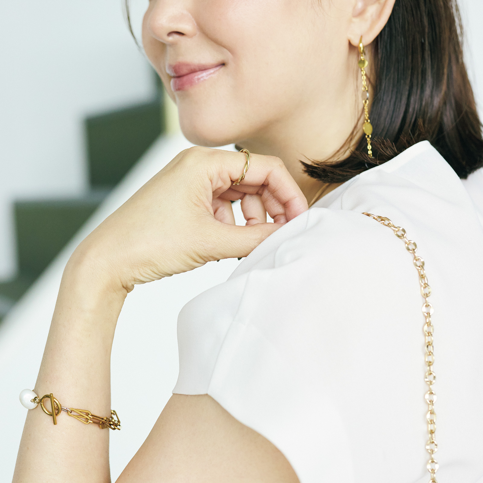 シンプルな装いに重厚感のあるこなれ感をプラスしてくれるのがゴールドでまとめたアクセサリー。