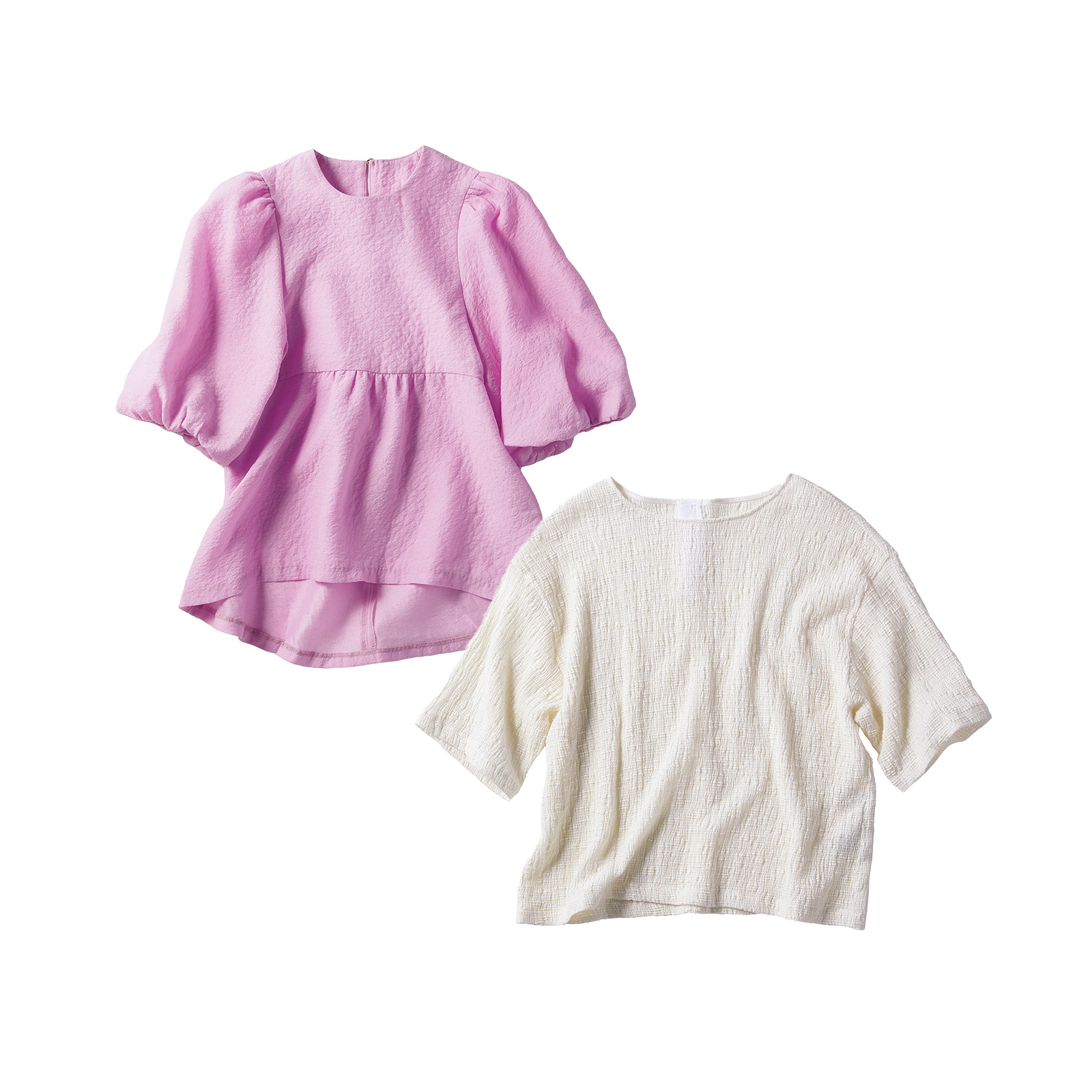 左、チークトップス 血色出しピンク ¥7,700(メイクアップトップス)右、白トップス¥16,500(アンタイトル)