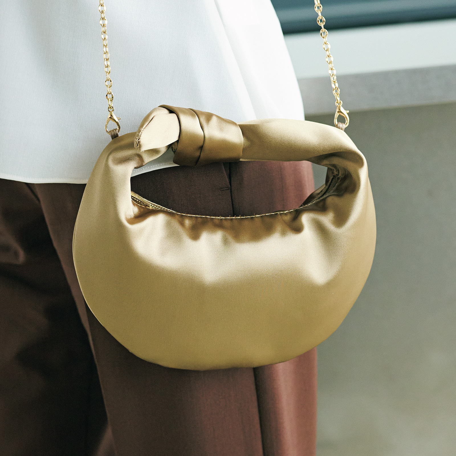 サテンTブラウス¥8,800(Emma Taylor/STYLEDOORE)ラップパンツ¥8,990(アンフィーロ)バッグ¥5,390(カシュカシュ/アンビリオン)フラットパンプス¥11,550(アルテミス by ダイアナ/アルテミス by ダイアナ アーバンドック ららぽーと豊洲店)ピアス¥3,850〈Filigran〉リング[人差し指]¥15,400〈tsugumi iwamoto〉(ともにロードス)ネックレス¥31,900ブレスレット¥4,950リング[薬指]¥12,100(すべてココシュニック オンキッチュ/ココシュニック)