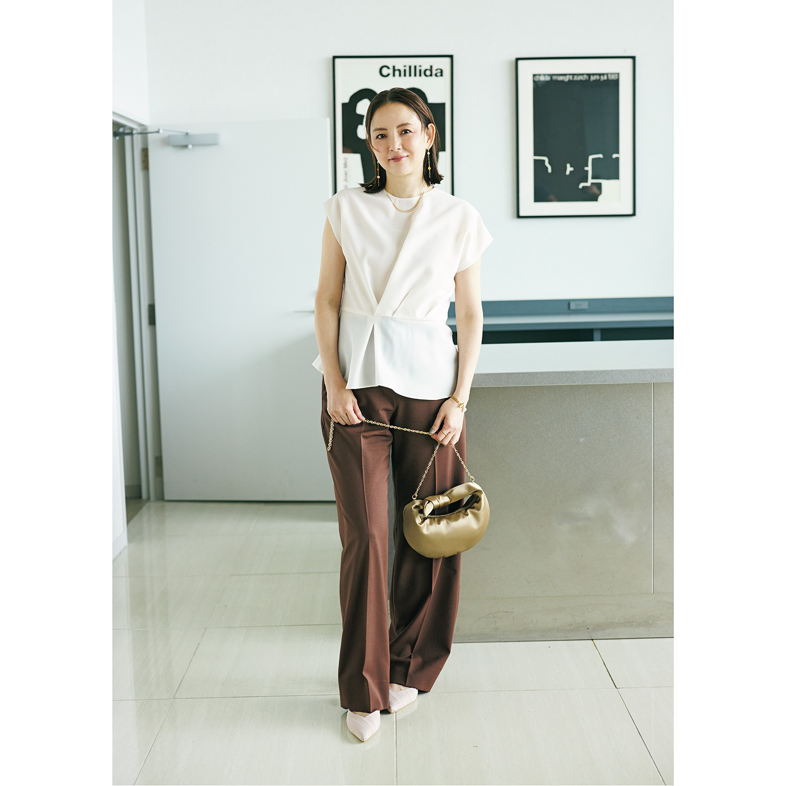 ブラウス¥29,700(ラヴェイユ/フランドルカスタマーサービス)パンツ¥20,000(バナナ・リパブリック)バッグ¥6,990(MANGO)フラットパンプス¥12,650(アルテミス by ダイアナ/アルテミス by ダイアナ アーバンドック ららぽーと豊洲店)ピアス¥3,850〈デイジールイス〉ブレスレット¥3,300〈ハクフルール〉(ともにロードス)ネックレス¥145,200〈ココシュニック〉リング¥8,800〈ココシュニック オンキッチュ〉(ともにココシュニック)