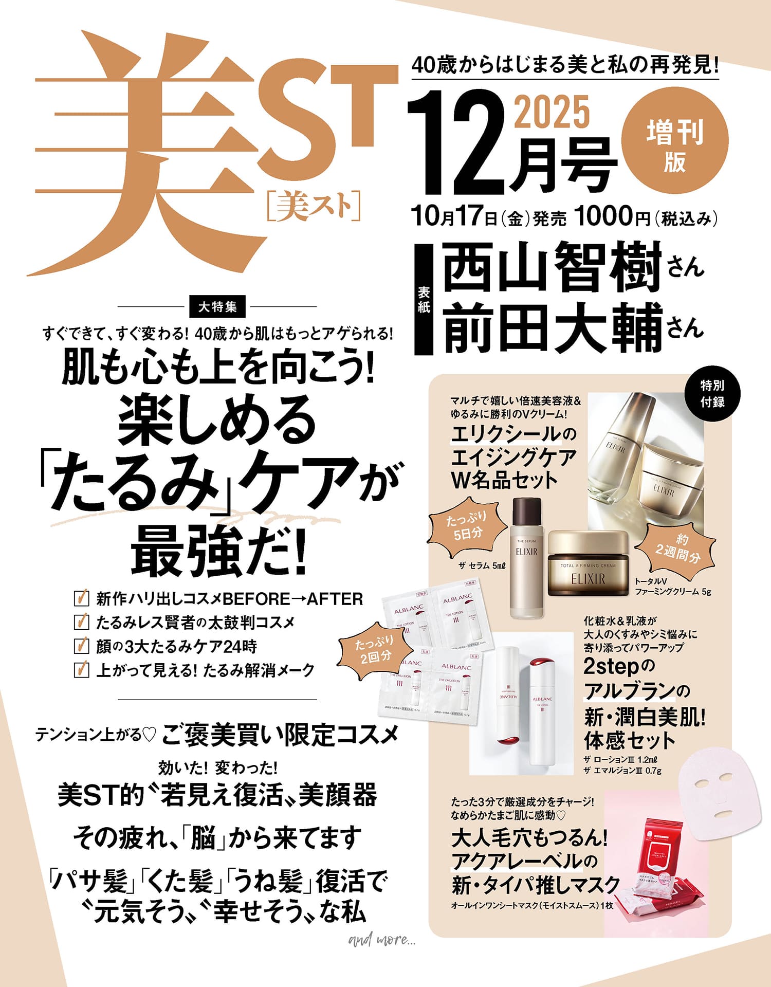 10月17日(金)発売・美ST12月号のネット書店予約がスタートしました!本誌は長澤まさみさん、増刊は西山智樹さん・前田大輔さんが初表紙を飾ります。本誌・増刊共通付録はエリクシールのエイジングケアW名品セット。さらに本誌にはコスメデコルテのエイジングケアエッセンスローションとアヴァンセの目元専用メークアップリムーバーのたっぷりボトルが付録に。増刊には、アルブランの新・潤白美肌!体感セットとアクアレーベルの新フェイスマスクが付録につきます。!ネット書店が完売の際はお近くの書店でのご予約がおすすめです。