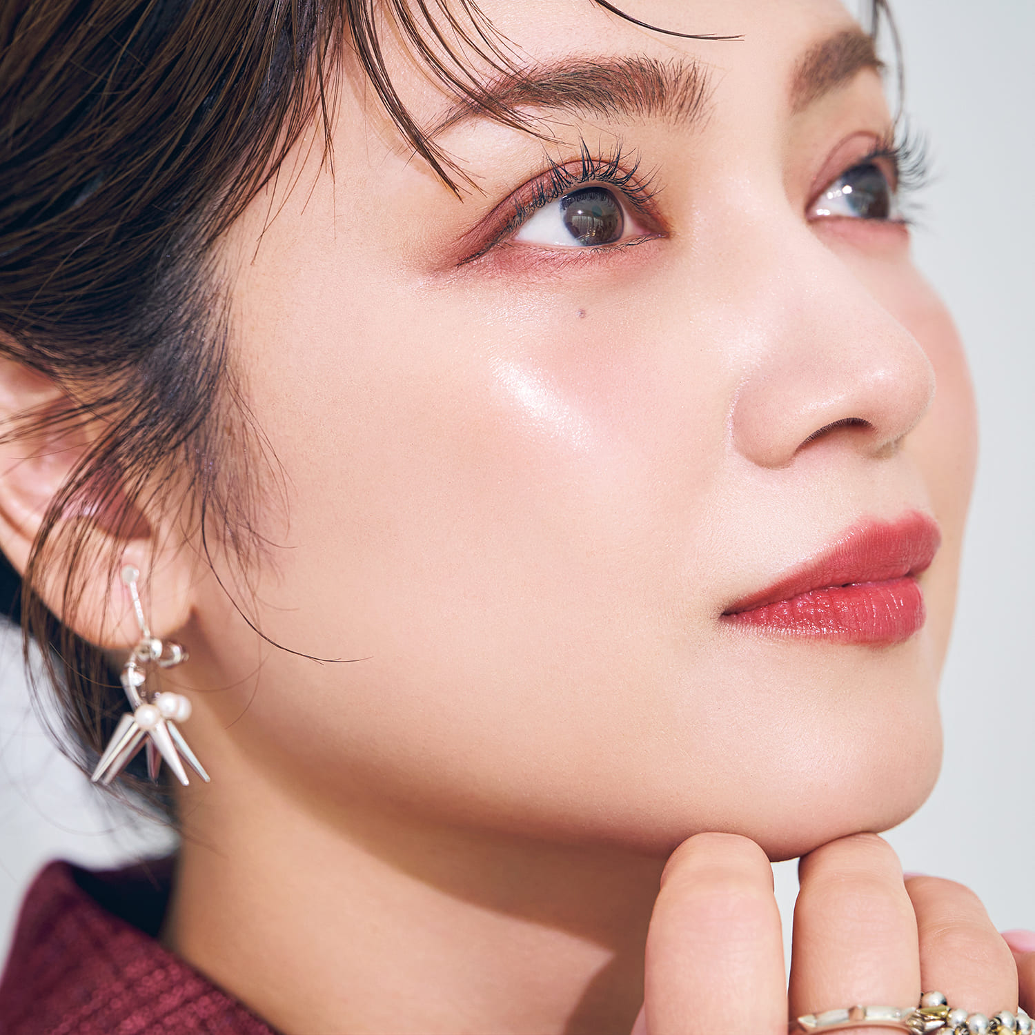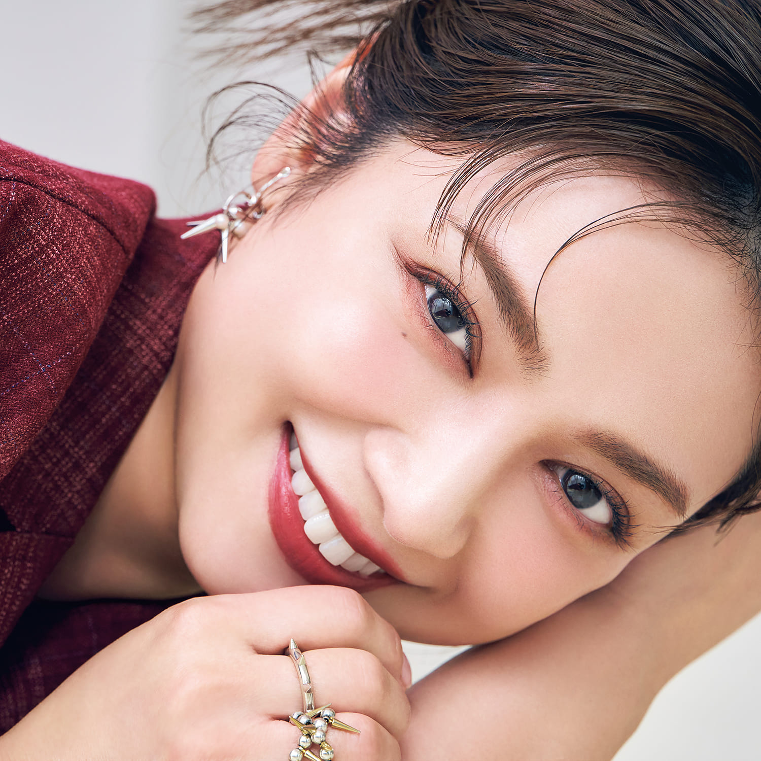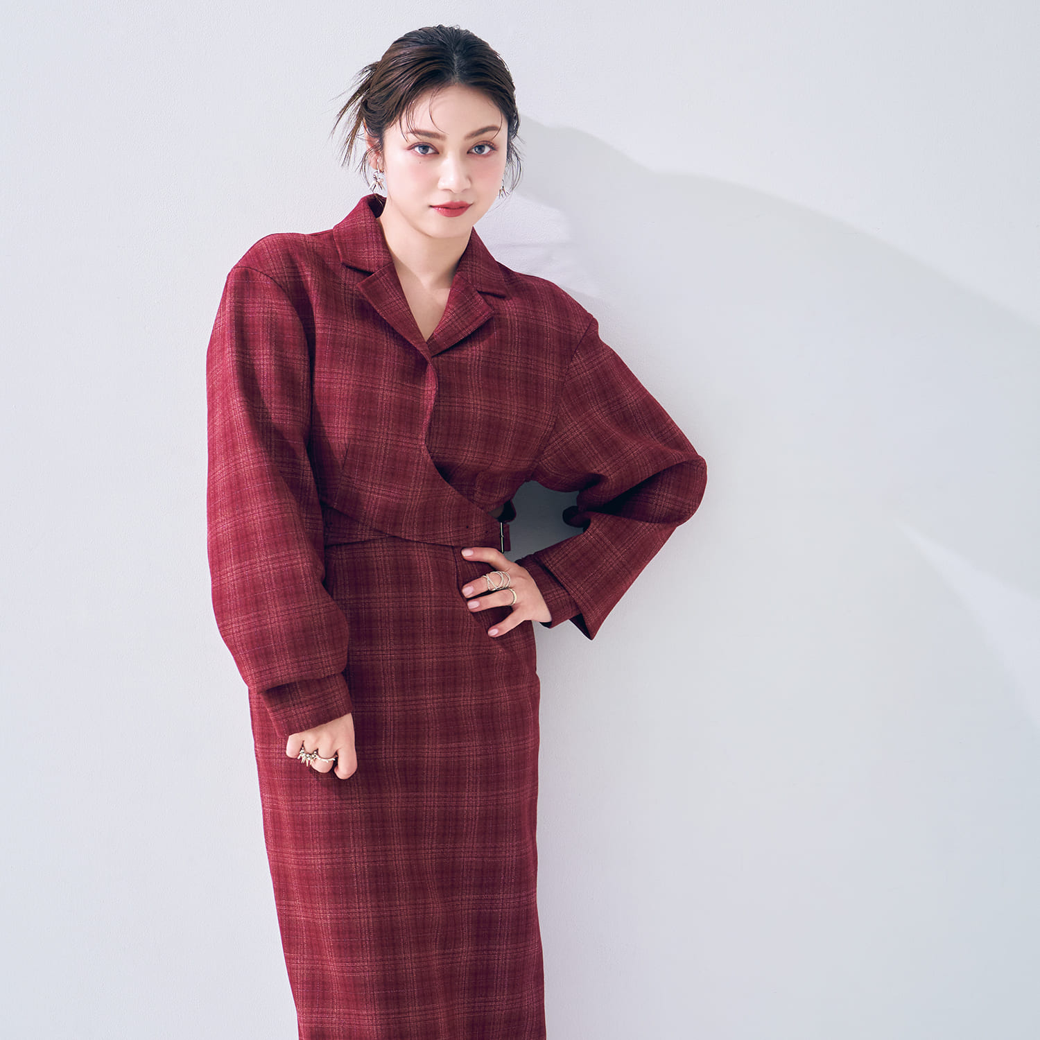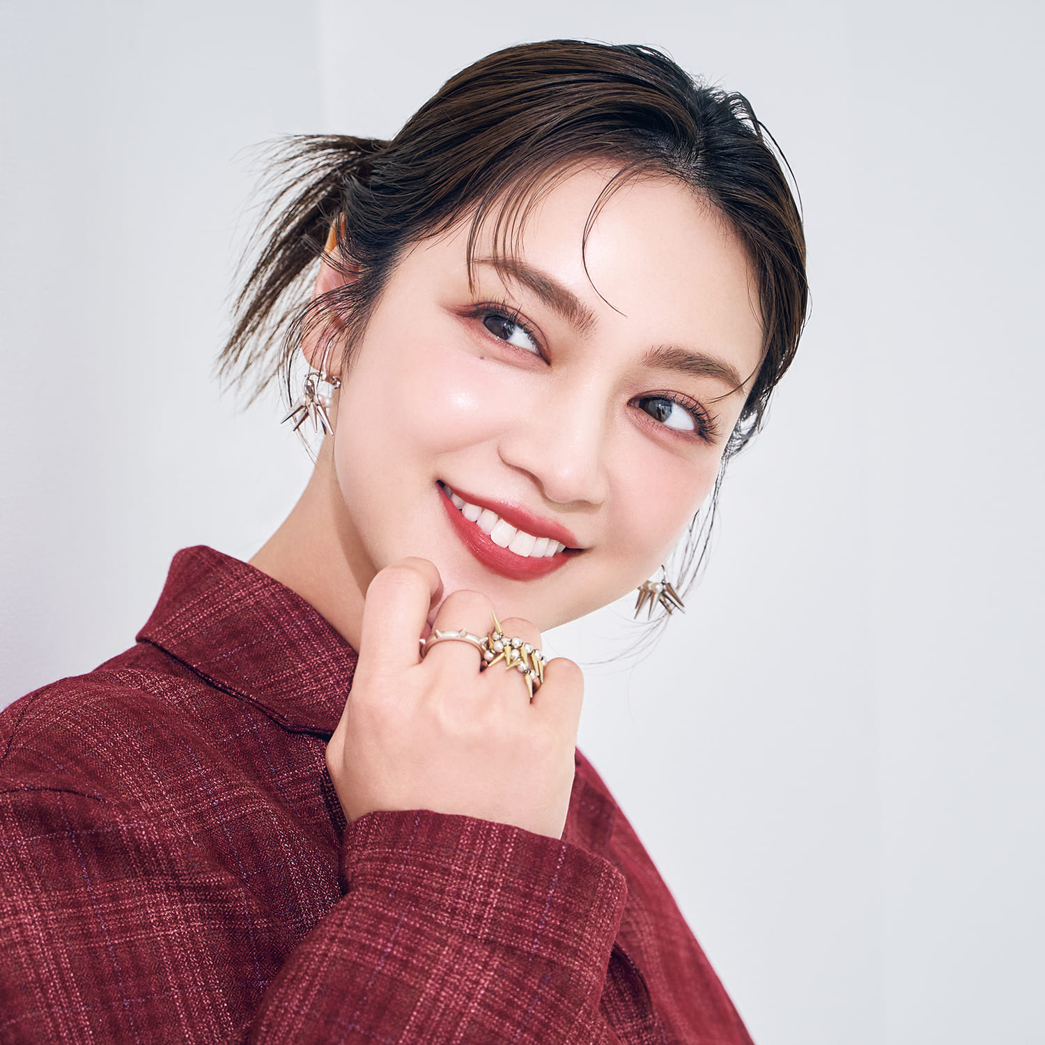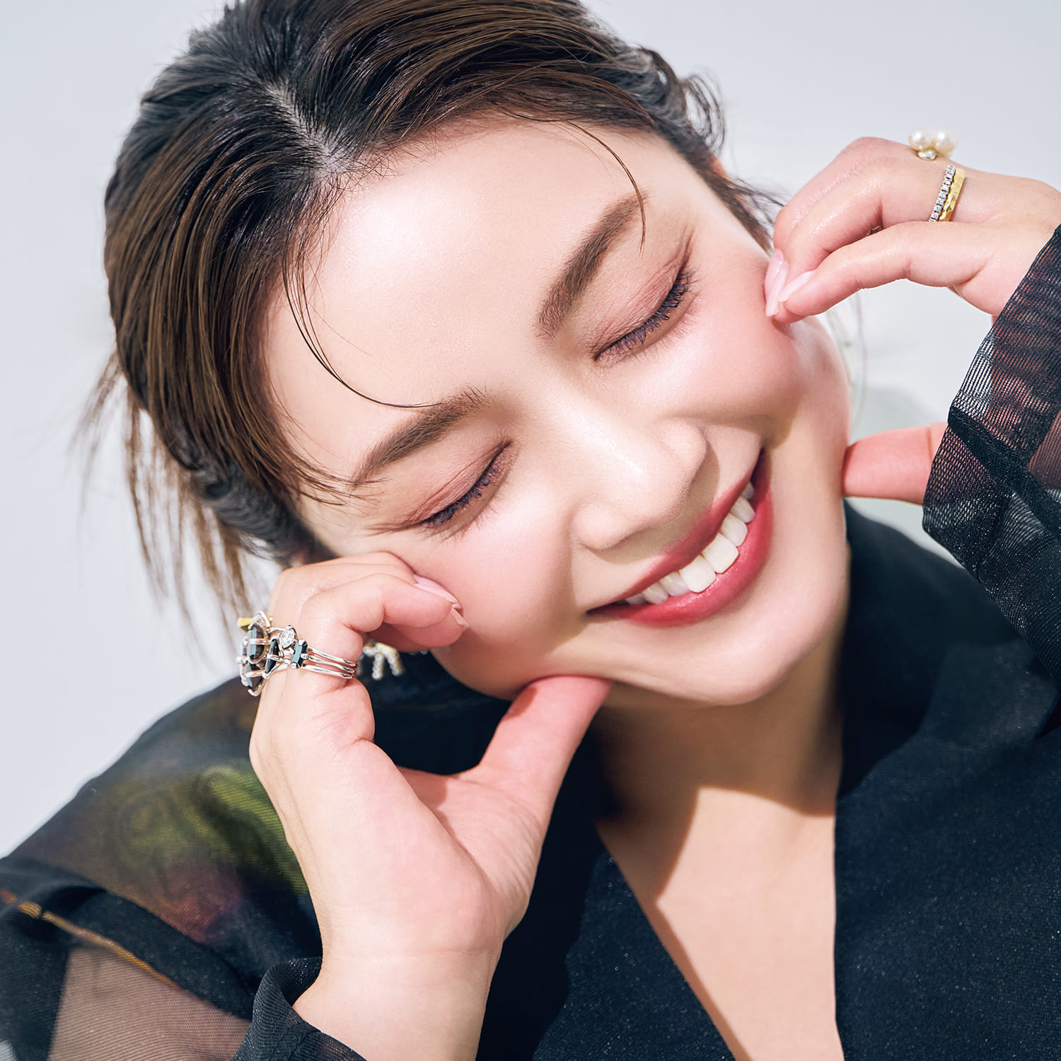 [写真1-5枚目]ドレス ¥27,500(Ameri)ピアス¥23,100 リング(右手薬指)¥36,300 リング(左手中指)¥59,400(すべてe.m.)他スタイリスト私物[写真6.7枚目]ジャケット ¥79,200(mukasa)リング(右手薬指、小指)¥105,600(ともにe.m.)他スタイリスト私物