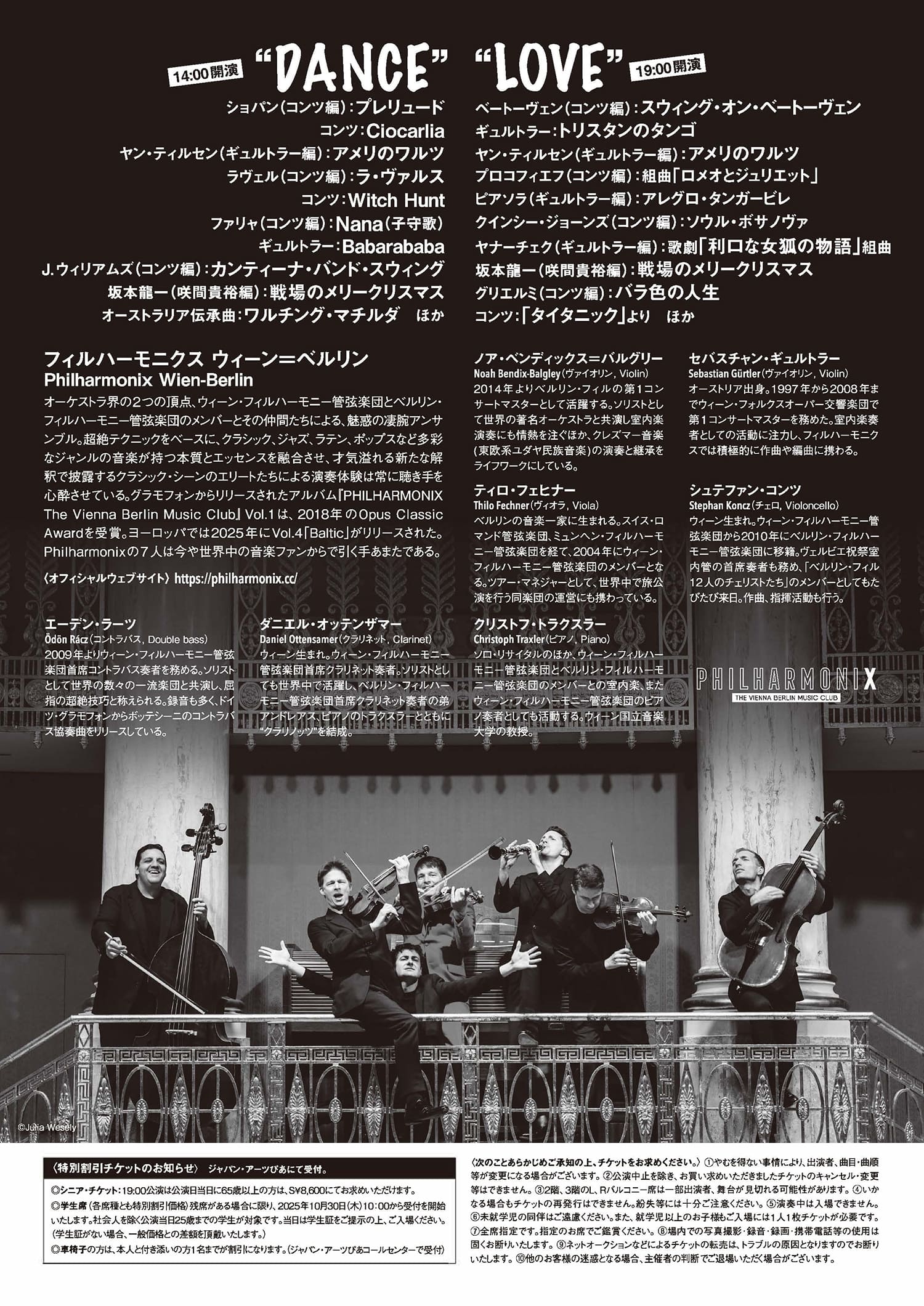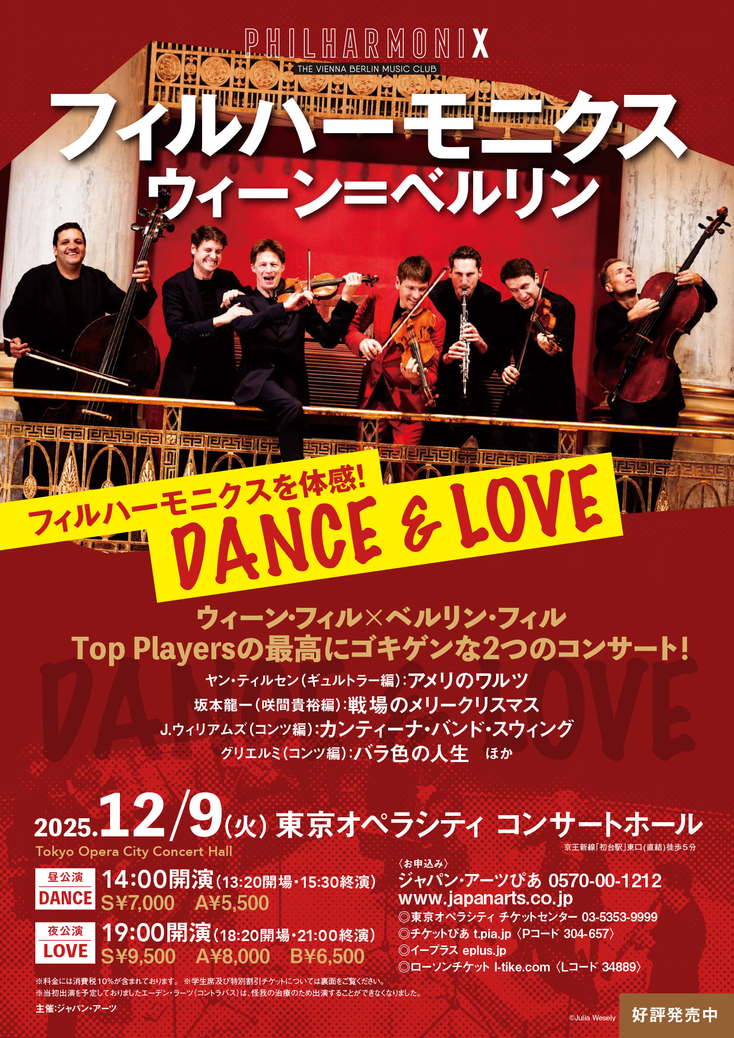 ウィーン・フィルハーモニー管弦楽団とベルリン・フィルハーモニー管弦楽団のメンバーによって結成された、アンサンブルグループ「フィルハーモニクス ウィーン=ベルリン」。 世界最高峰のTop Plyersたちの卓越した演奏技術による、ジャンルにとらわれない「フィルハーモニクス」の最高にハッピーなコンサートが、昨年に引き続き今年も12月に開催されます。お馴染みの曲でDANCE&LOVEを体感!