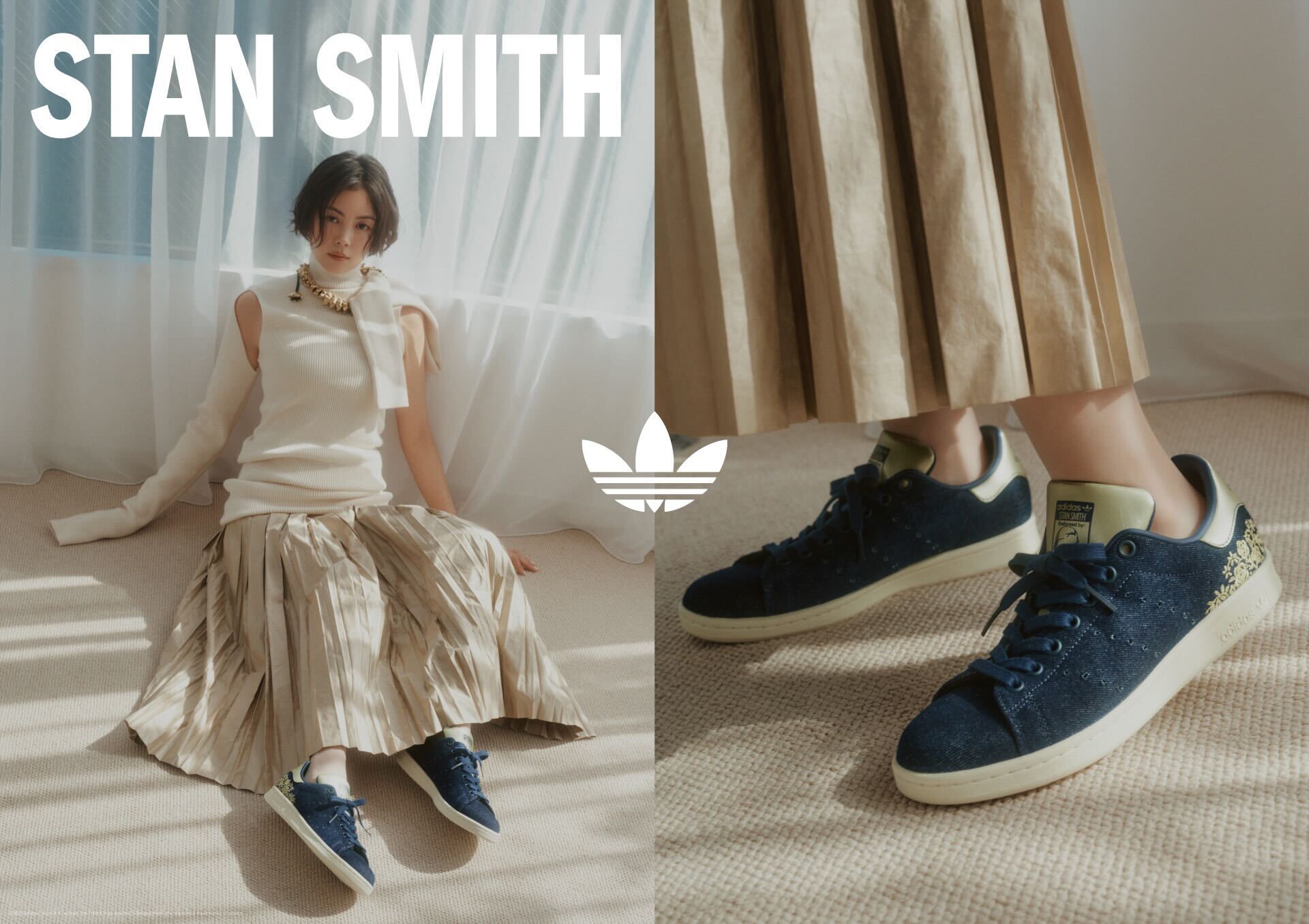 矢野さんの新ビジュアルは、清潔感のあるホワイトスタイルが印象的。足元に「STAN SMITH DENIM」を合わせるだけで、女性らしい上品さとわずかな抜け感が生まれ、デイリーの着回しがもっと楽しくなりそう。