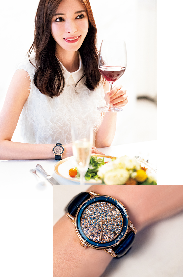 透明感溢れる美しさで読者に大人気。プライベートでは2人の男の子の母親として日々、奮闘中。時計愛はル ブラッシュのファクトリーを昨年訪れてから一層深まりました。