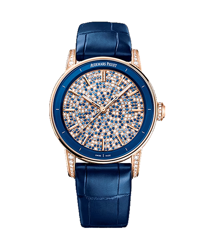CODE 11.59 バイ オーデマ ピゲ オート マティック/時計全体で910個のブリリアントカットダイヤモンド、約3.53カラット。ダイヤルには533個のブリリアントカットダイヤモンドとサファイア、約1.95カラットが星屑のように煌めきを絶やさず、一度目にしたら脳裏に焼き付く麗しの表情。パーリーダークブルーアリゲーターストラップ、ケース径38㎜、厚さ9.6㎜。(オーデマ ピゲ/オーデマ ピゲ ジャパン)