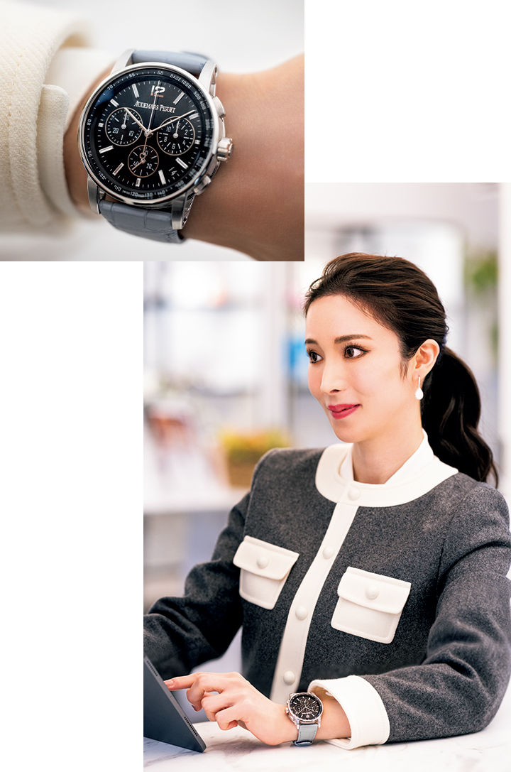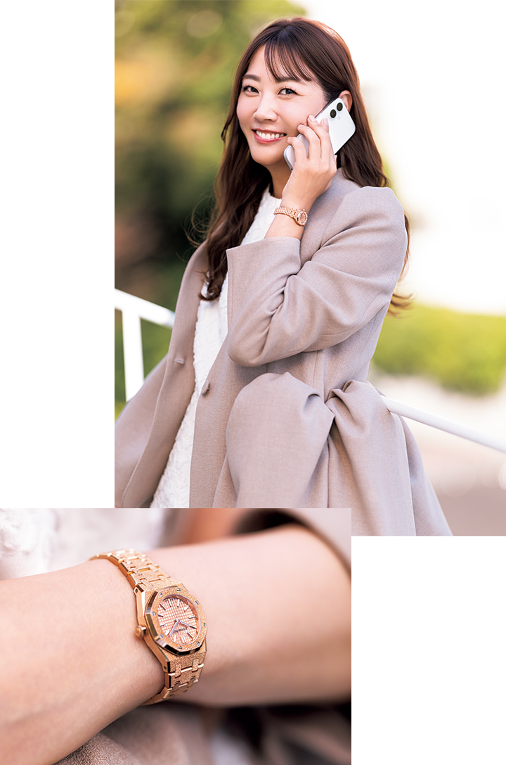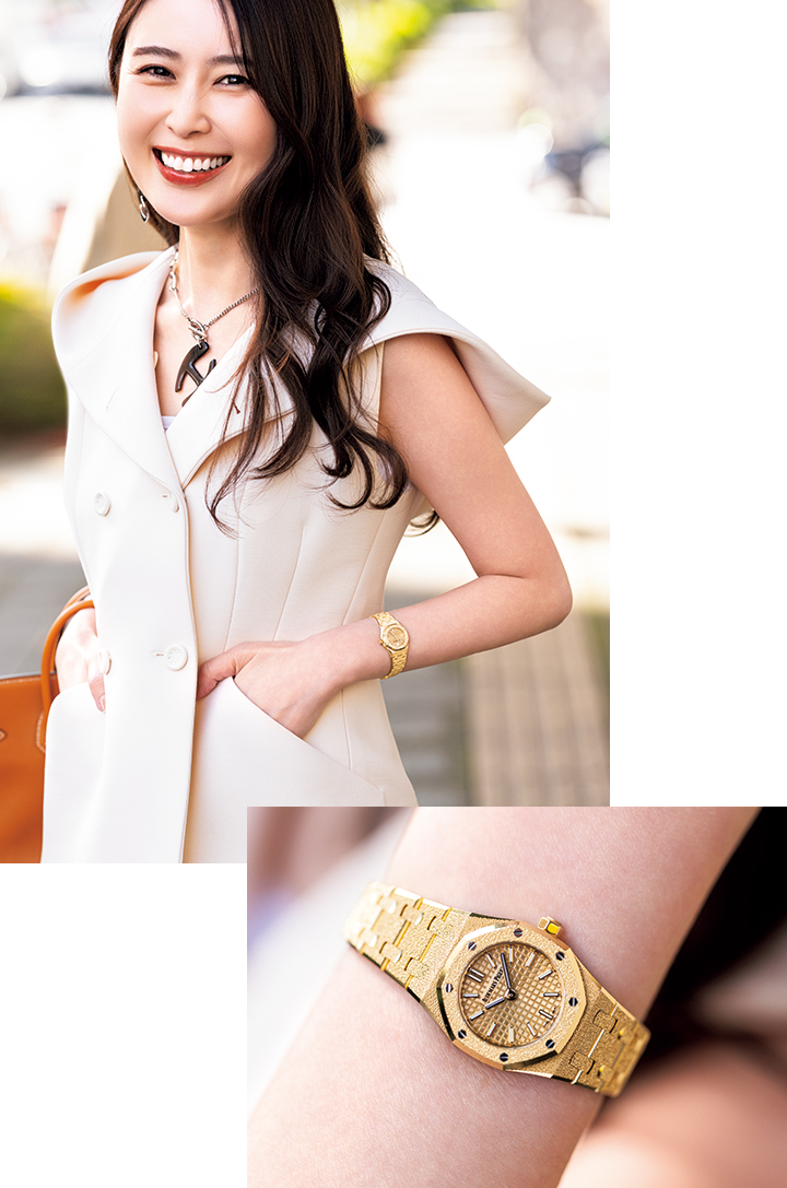 オーデマ ピゲの時計を身につけているとパワーがもらえます。「装う」だけで元気になれる、私にとってはカンフル剤的な役割もあるんです。ちょっと疲れている時にもオーデマ ピゲの時計を身につけるだけで、エナジードリンクを飲んだような感覚、シャキッとするんですよね。最近は女性らしいたおやかなスタイルも多いので、こちらのイエローゴールドのロイヤル オーク ミニはぴったりです。それでもきちんと意志が感じられて美しい。今の気分にぴったりの時計だと思います。輝きはもちろんなんですが、特に気に入っているのはサイズ感。華奢に終わらずしっかりと主張を感じられる。働く女性にとって、まさにパートナー的な存在だと感じています。