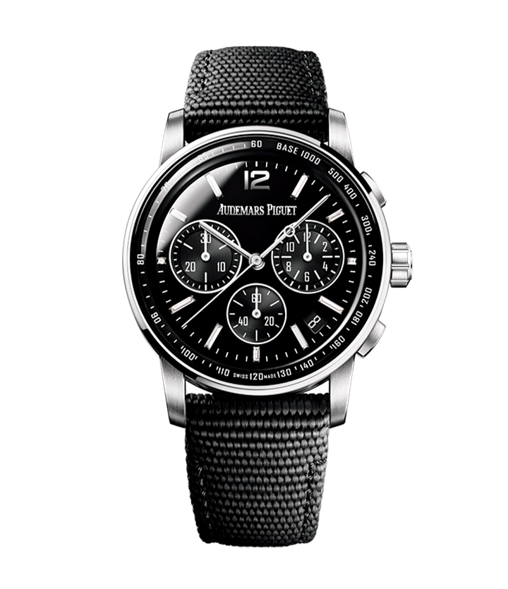 仕事ではオニキスがキリッとハンサムな印象を与えてくれるCODE 11.59 バイ オーデマ ピゲ クロノグラフで。インパクト大のケース径41㎜の大きめサイズ、ホワイトゴールドケースにオニキスダイヤルで気分転換。(オーデマ ピゲ/オーデマ ピゲ ジャパン)