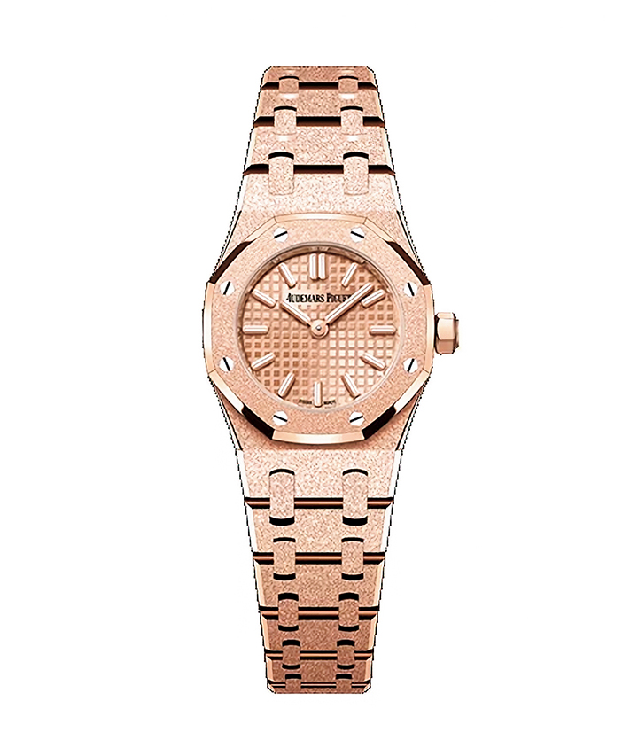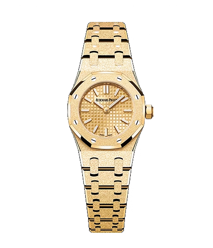 ロイヤル オーク ミニ フロステッドゴールド クォーツ/1997年に登場した「ミニ ロイヤル オーク」からインスピレーションを受け誕生した23㎜のモデル。ケースとブレスレットはイタリア出身のキャロリーナ・ブッチのデザインによるフロステッドゴールド、ダイヤルはトーンオントーンのプチタペストリー。カラーは18Kイエローゴールド、18Kホワイトゴールド、18Kピンクゴールドの3種類。¥5,225,000(オーデマ ピゲ/オーデマ ピゲ ジャパン)