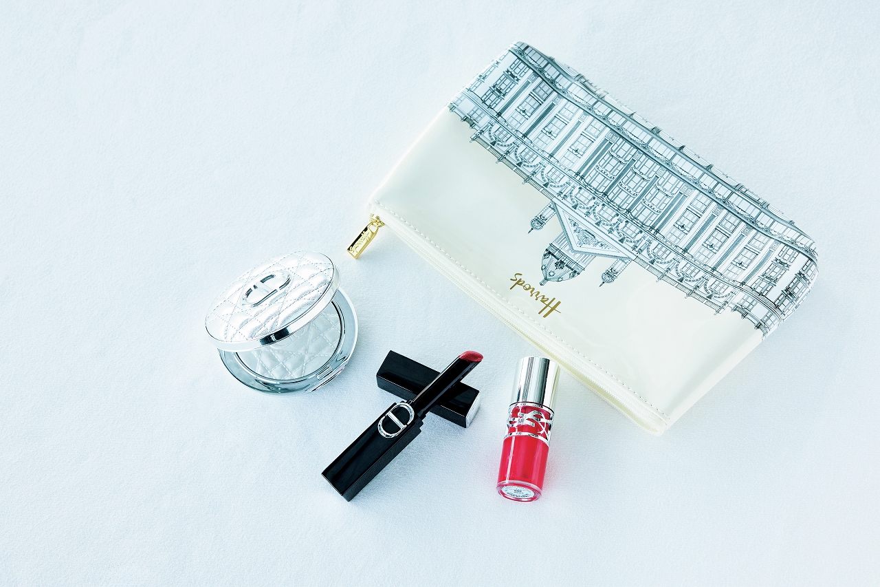 旬のバズリップはBAさんおすすめの大人っぽい深みレッドをチョイス。飲食しても落ちにくいから、急に撮影タイムになっても塗り直しなしで参加可能。ハロッズのポーチには、ぷるんとした唇になるYSLのプランパー7や、キラキラパッケージのディオールルミナイザー06もイン。かぶりコスメを見せ合うのも楽しい時間です♡