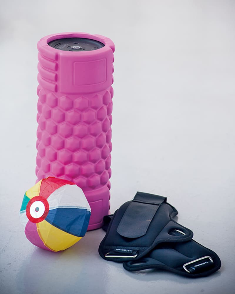 オリンピック金メダリストの室伏広治さんが考案した紙風船エクササイズをし、筋膜ローラーに寝転がってゴロゴロ、1キロのリストウエイトで負荷をかけてトレーニングを。
