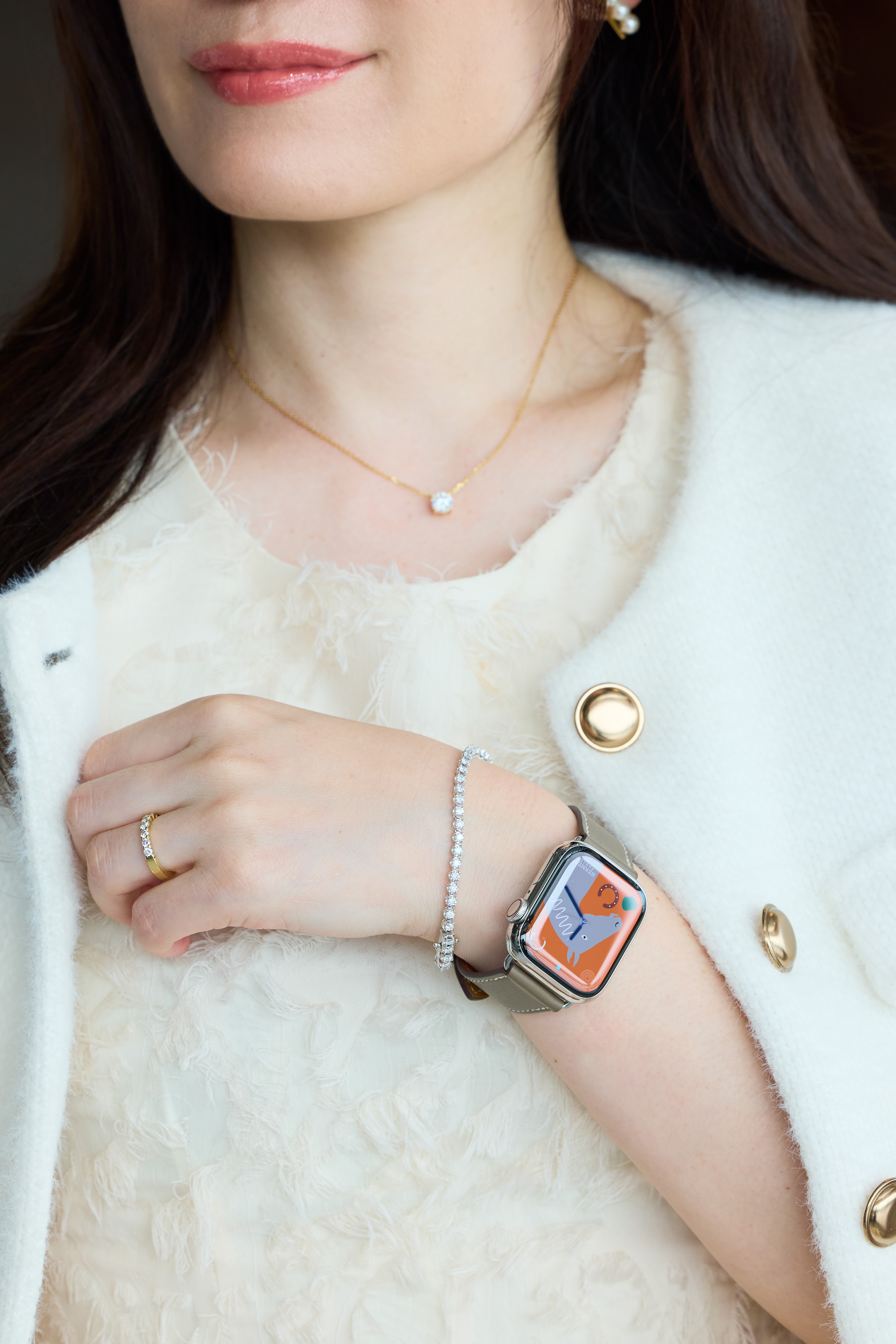 オレンジに光るたびに「可愛い♡」と褒められる、Apple Watch Hermès。中身は通常のApple Watchと同じだから機能性も高いですし、ビジネスシーンではシンプルな文字盤に変更も可能。女子会はもちろん、どんなシーンでも使える万能なブランドウォッチです。そこにティファニーのダイヤのブレスレットを合わせることで、エレガントな印象を高めました。