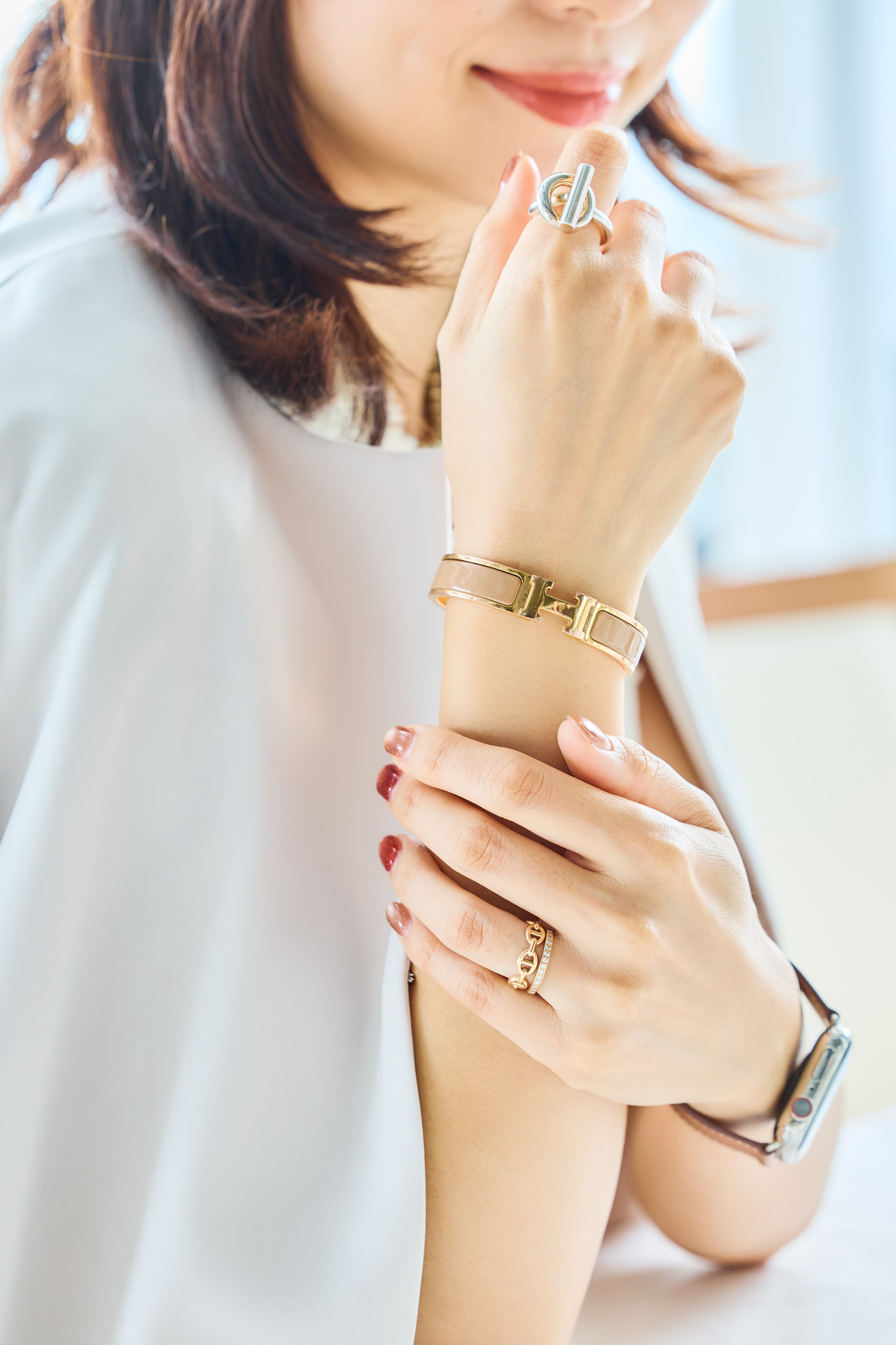 昨年のクリスマスプレゼントに夫に買ってもらった、エルメスのバングルとリング。華奢ながらも存在感のあるアイテムで、女性らしい柔らかさと洗練さを演出できるのがお気に入り。女子会では、あまり「頑張ってる感」を出しすぎずに、さりげなく“自分らしさ”を表現できるアクセが大活躍します。