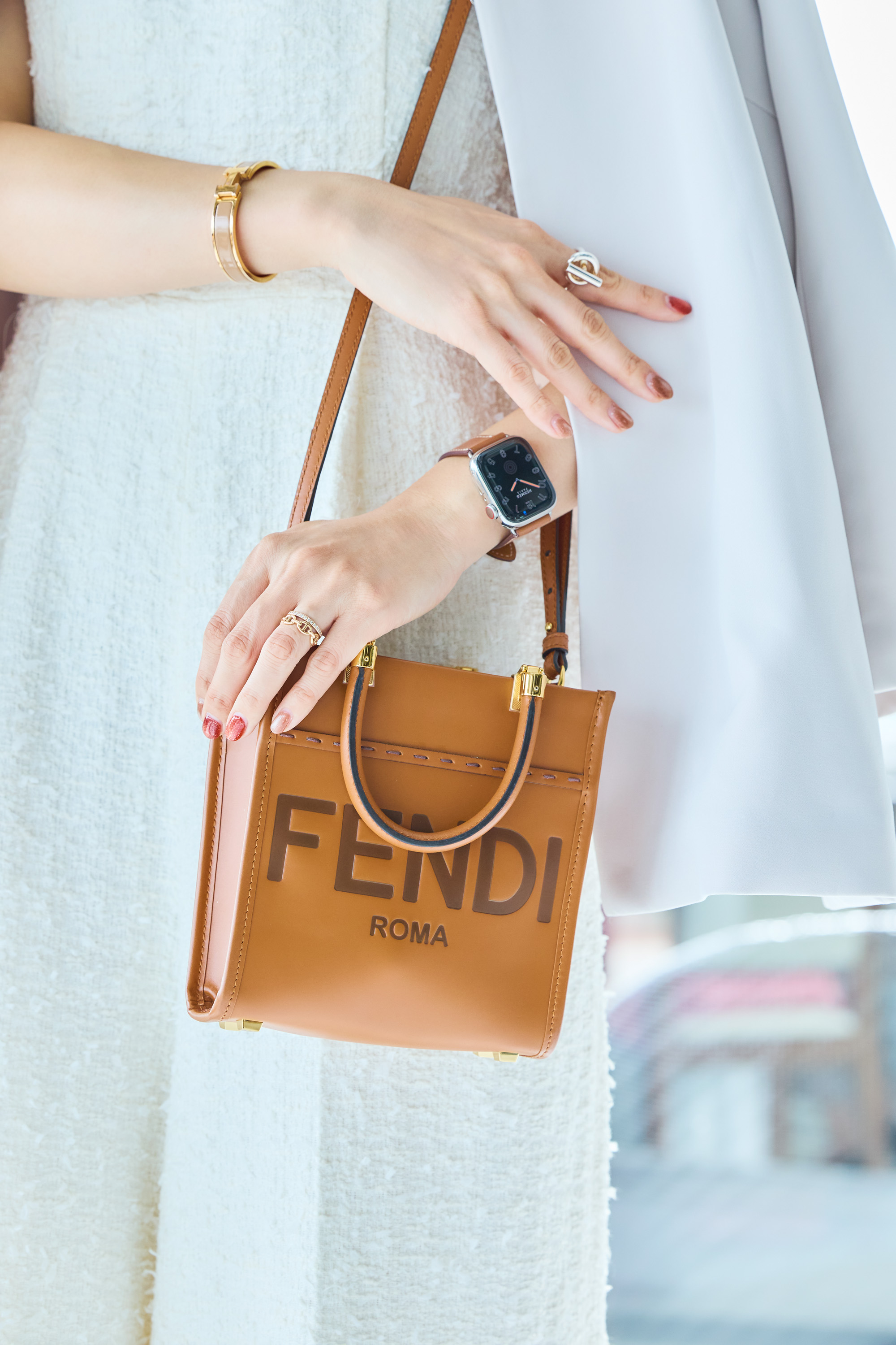 ホワイトコーデの差し色として、バッグやジュエリーをベージュに統一。王道ブランドだけど主張しすぎないアイテムを合わせることで、女性らしさを演出していました。