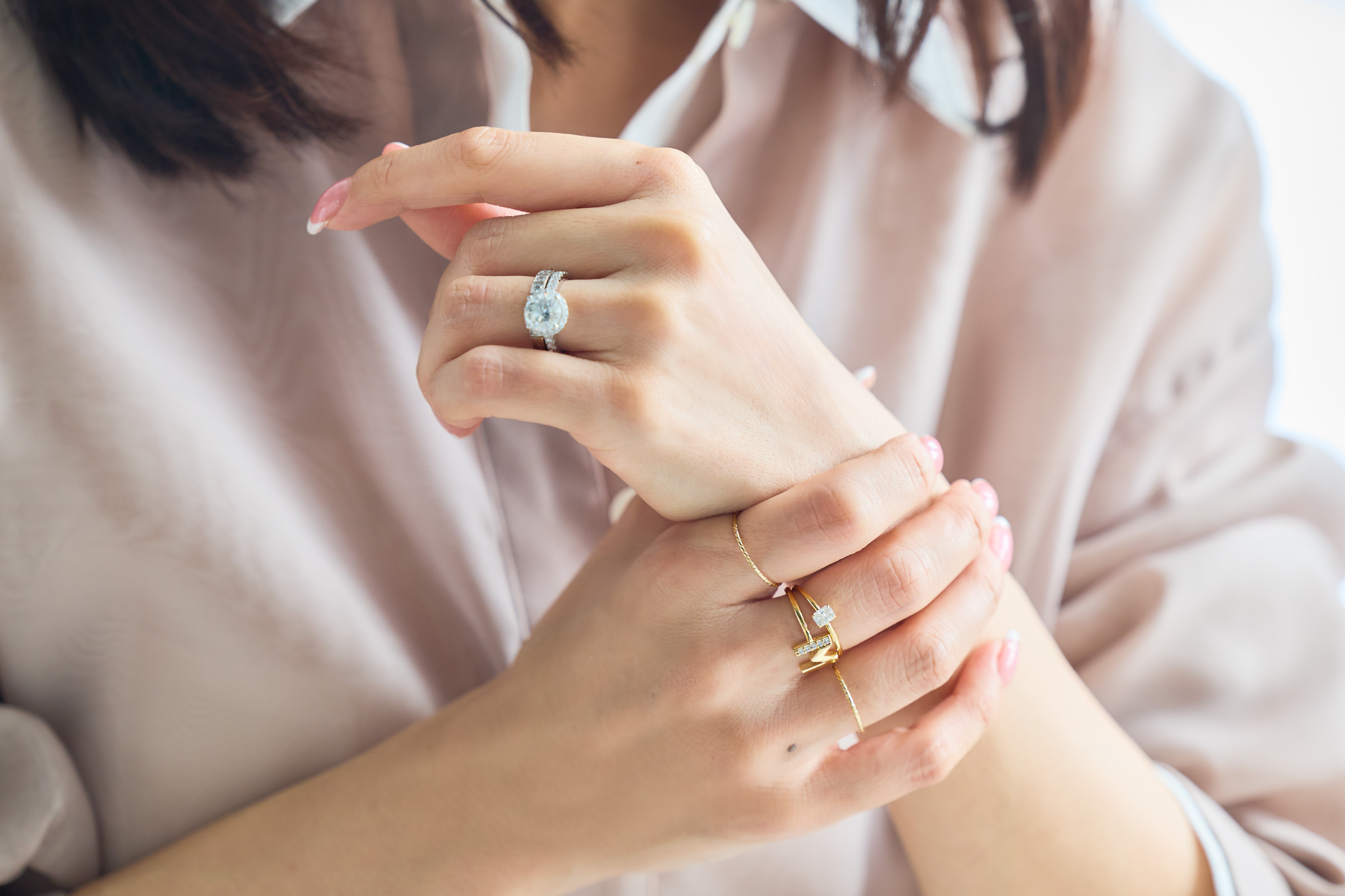 左手のダイヤのリングは、結婚10周年に夫からプレゼントされたもの。女子会など華やかな場へのお出かけの際につけます。右手のイニシャルリングはステラハリウッド、小さい石はブリジャール、細いリングはalohasmile。ちょっぴりカジュアルなこの組み合わせが今のお気に入り♡