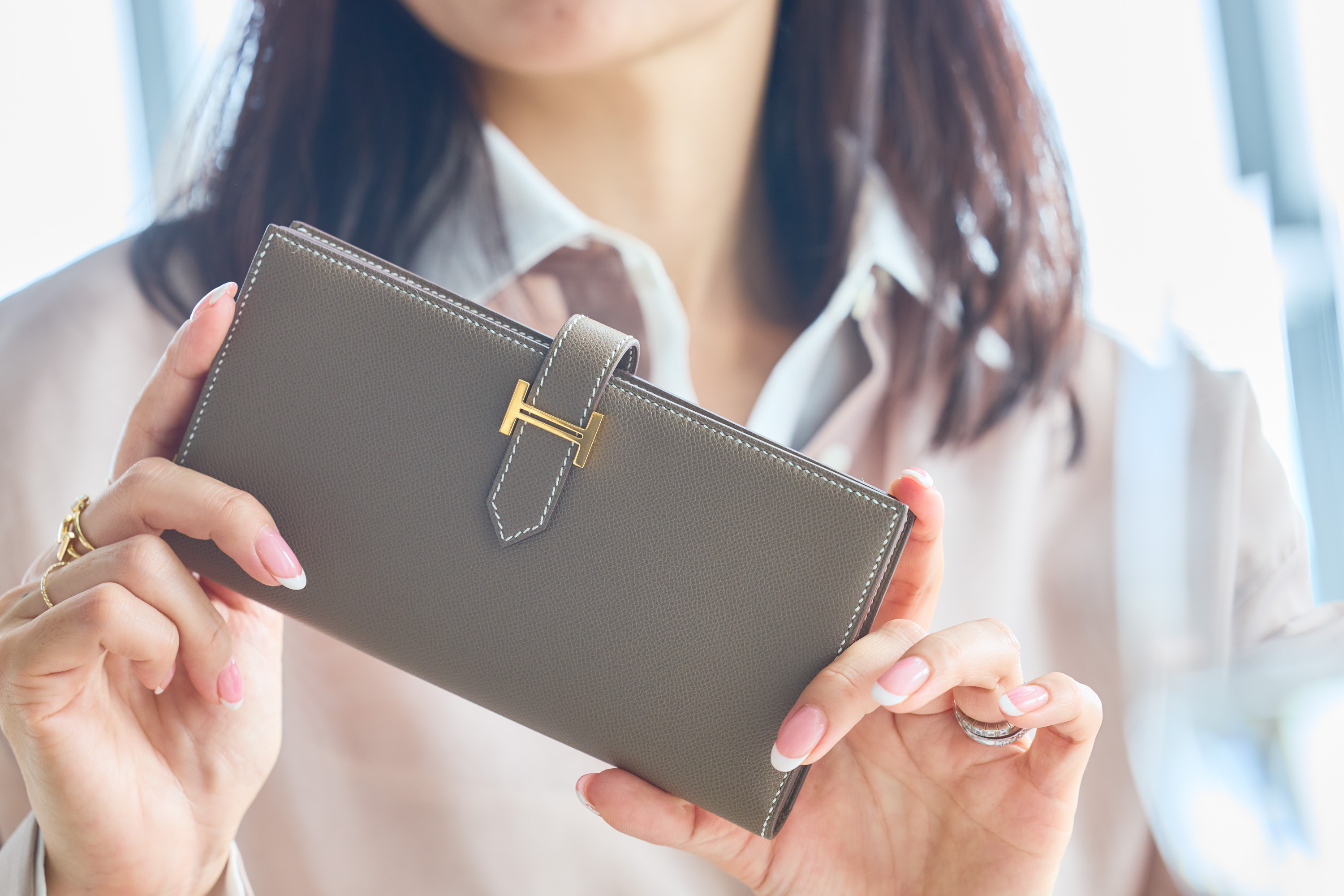 お気に入りのエルメスのお財布、ベアンも今日はエトゥープで揃えました。ケリーバッグの中でもスマートに収まり、お会計時にテーブルの上に置いても絵になります。このカラーは華美すぎず知的な雰囲気があるのも大人の集まりにぴったりです。