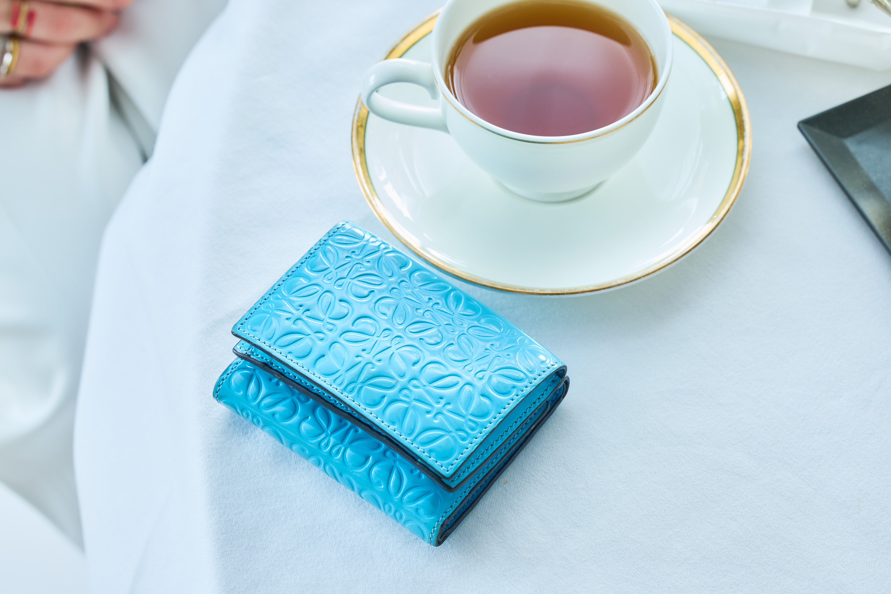 爽やかブルーが可愛いロエベのウォレット。洋服がシンプルな分、鮮やかなブルーのお財布を持つことでテンションもアップ。淡いベージュ×ホワイトの単色コーデに、同系色のセリーヌのバッグで統一感を。
