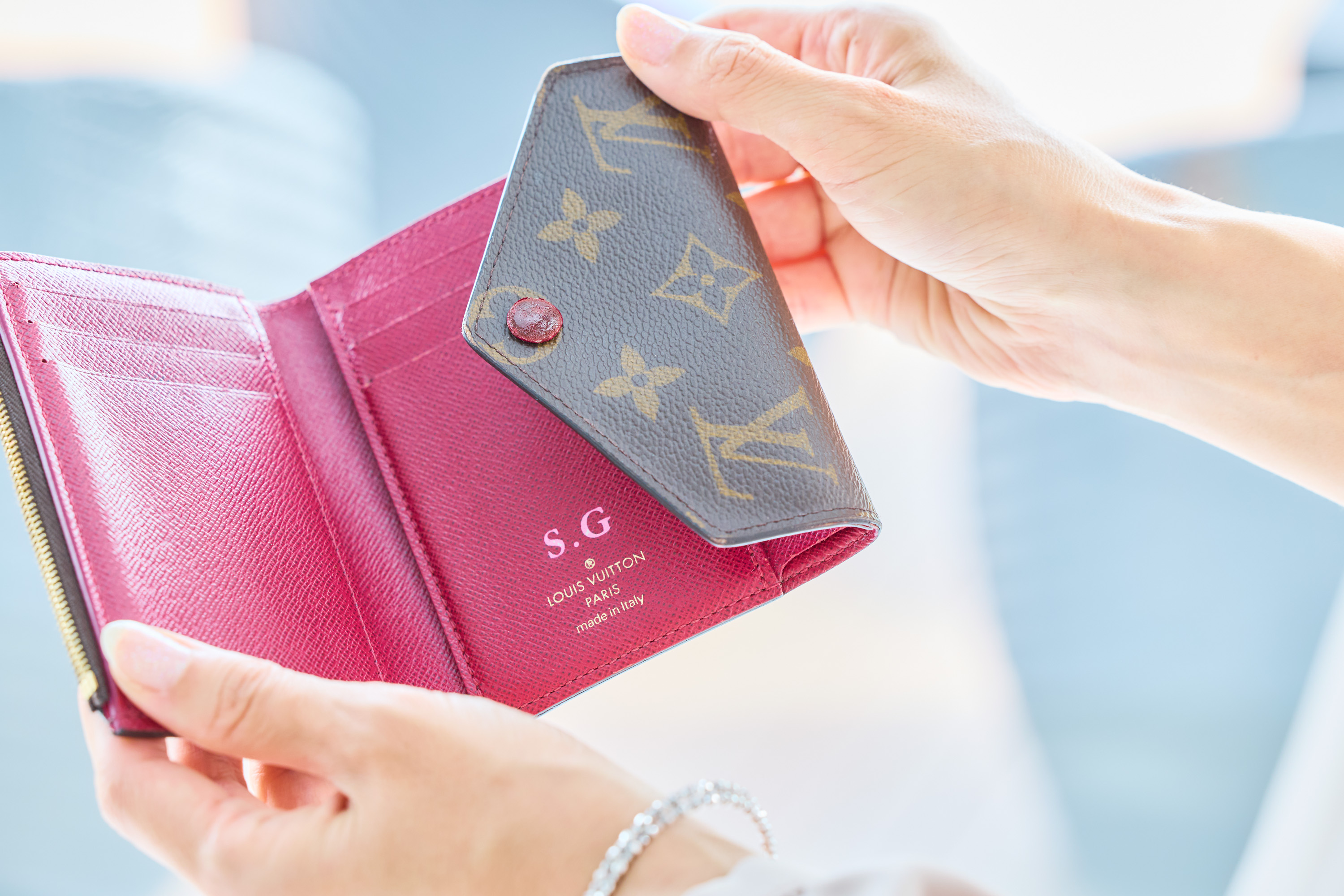 お財布を開いた瞬間ふわりとのぞくピンクがかわいいルイ・ヴィトンのお財布。控えめながらもラグジュアリーな存在感で、お会計の瞬間さえエレガントに演出してくれます。女子会にはこのお財布で行くことが多いです。