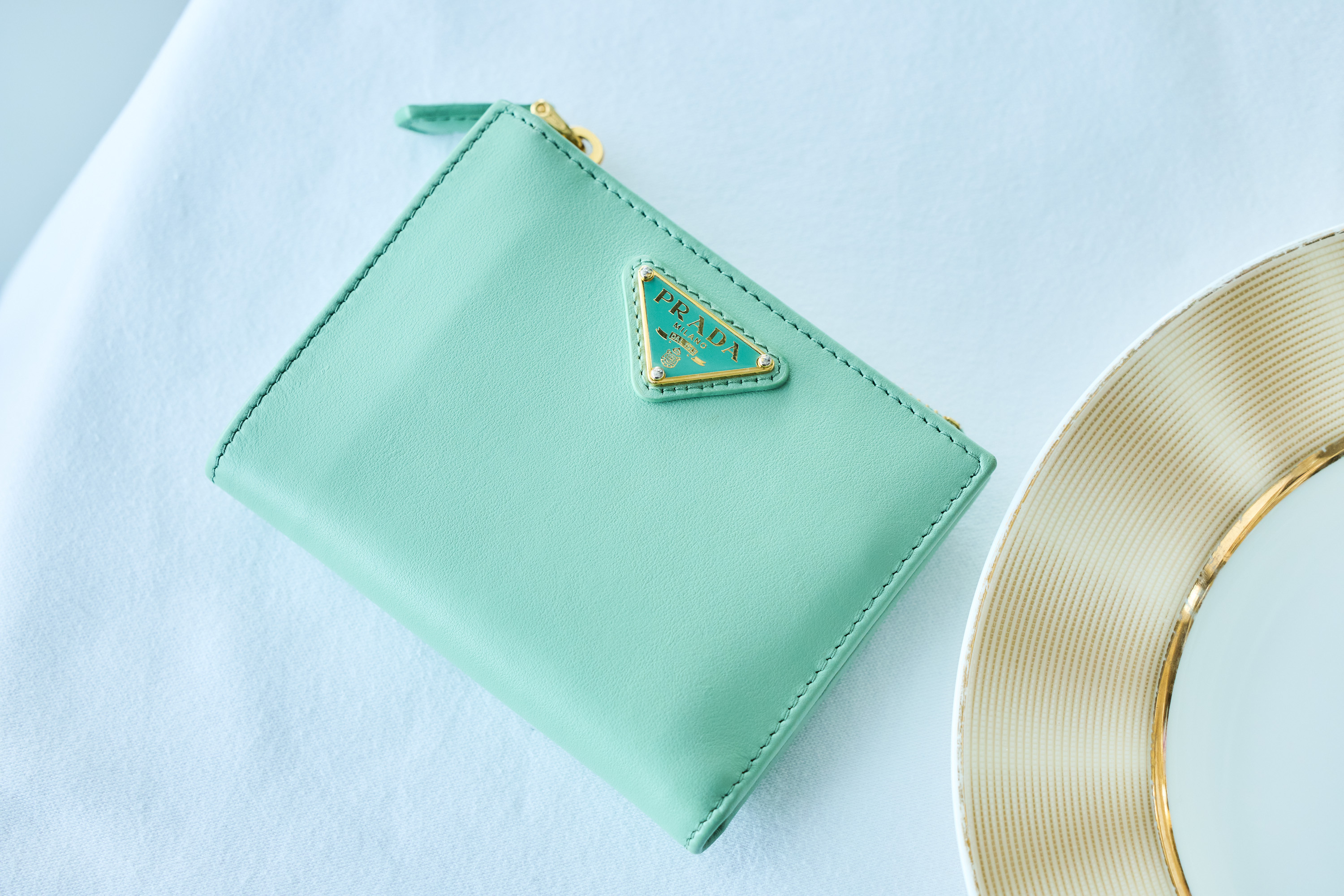 小さめバッグにも入る、コンパクトなプラダの財布。最近は現金のやり取りも少ないので、この大きさで十分! バッグはベーシックカラーを選びがちだから、お財布などの小物はミントカラーなどの華やかカラーが多め。可愛いもの好きが多い女子会でも、何度も褒められるほど人気のウォレット。