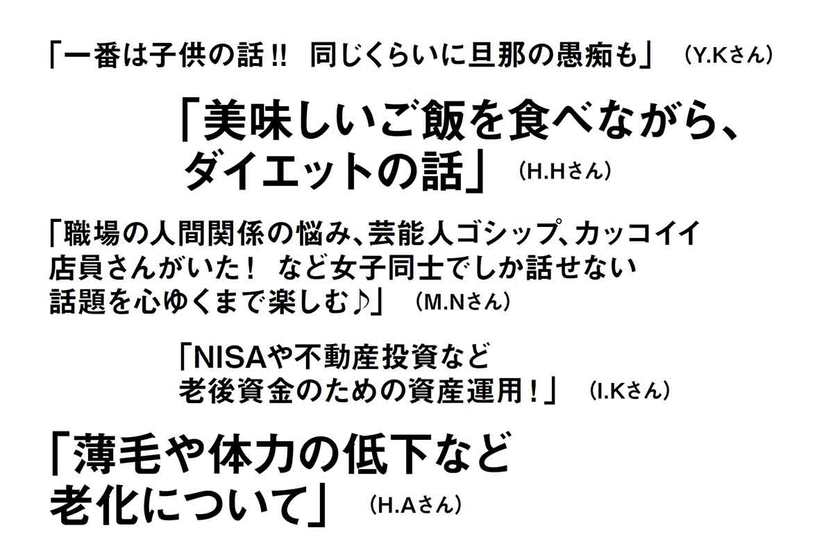 女子会で繰り広げられる話題は、美容、仕事、家庭、グルメ、旅行……と多岐にわたります。ぶっちゃけトークの後は、「いろいろあるけど明日からも頑張ろうね~!」と互いを褒め、励まし合ってスッキリするのがパターン。また恋愛やお金の話は各自でネタがあれば披露するけど、探り合いはナシ。互いに踏み込む領域が決まっているのも、楽しい雰囲気で締めくくるための暗黙のルール。