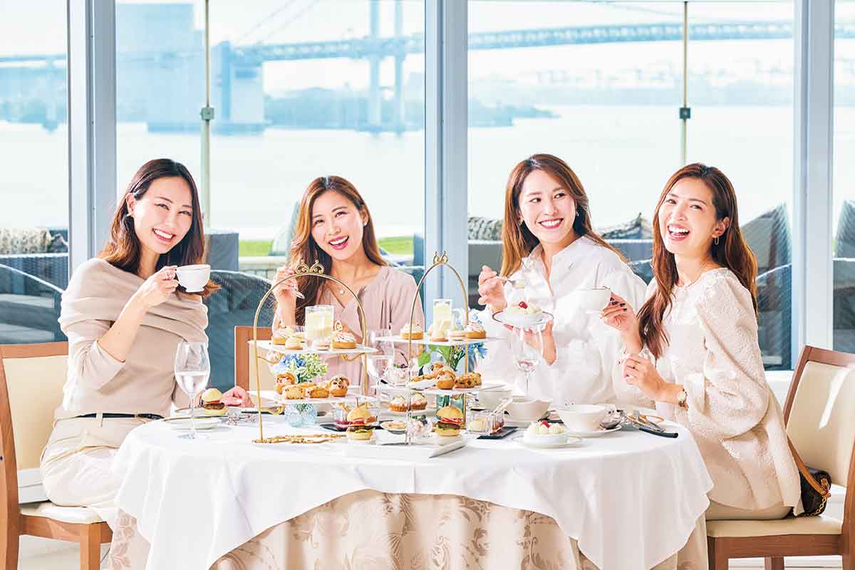 レインボーブリッジをはじめ東京湾岸の景色を堪能しながら、季節のアフタヌーンティーが楽しめます。リュクスたちがいただいたのは雪のように真っ白なスイーツとセイボリーをラインナップした「スノーホワイトアフタヌーンティー」(平日¥6,380/土日祝¥7,480・サ別)。スノーホワイトショートケーキも豪華で、ジャガイモのポタージュや特製ハンバーガーなど、セイボリーも充実の内容です。※内容が変更となることがございます。ご了承ください。