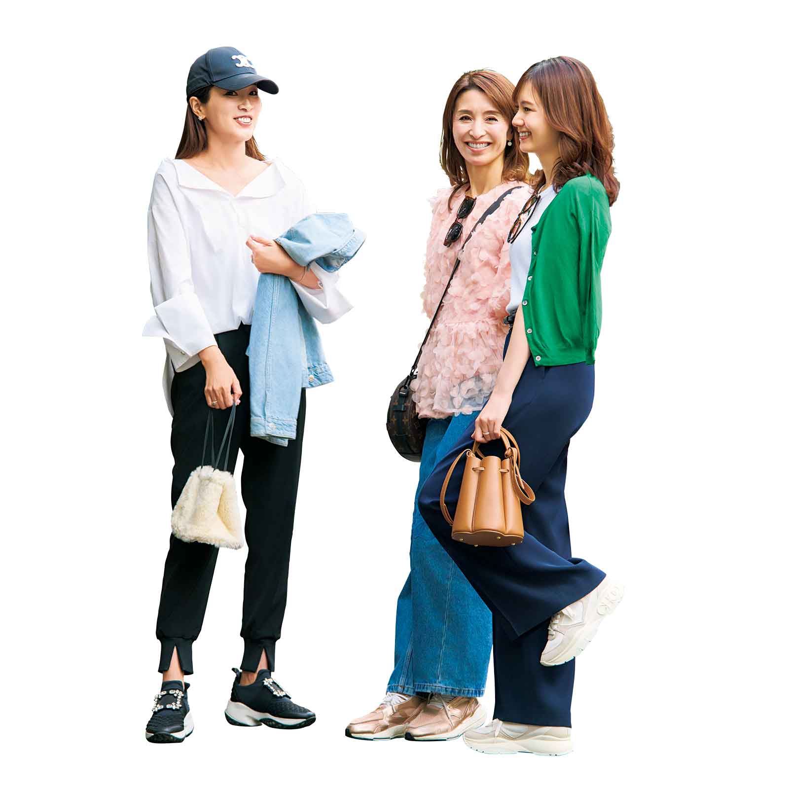 左から/モノトーンコーデを華やかに魅せるロジェヴィヴィエのスニーカー(古川さん)。トップスと同系色のステラマッカートニーのシューズで、カジュアルコーデも大人可愛く(高麗さん)。コーデが爽やかに仕上がるジミーチュウの白スニーカーは高確率で褒められます(松野さん)。