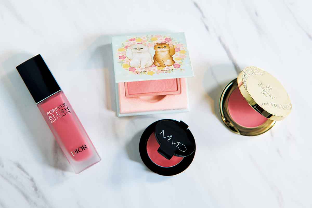 DIORクッションでツヤ肌に。エレガンスのチークPK101をふんわりのせ、DIORリップ094でプルプル唇に(古川さん)。レカルカの美白UV下地に、MiMCのクリームチーク11とポール&ジョーのパウダーチーク02を重ねジュワッと感を。DIORリップ256でツヤを(高麗さん)。コスデコの下地でトーンアップさせ、DIORチーク05で血色感をプラス。淡いピンクのDIORリップ001でハッピーフェイスに(松野さん)。