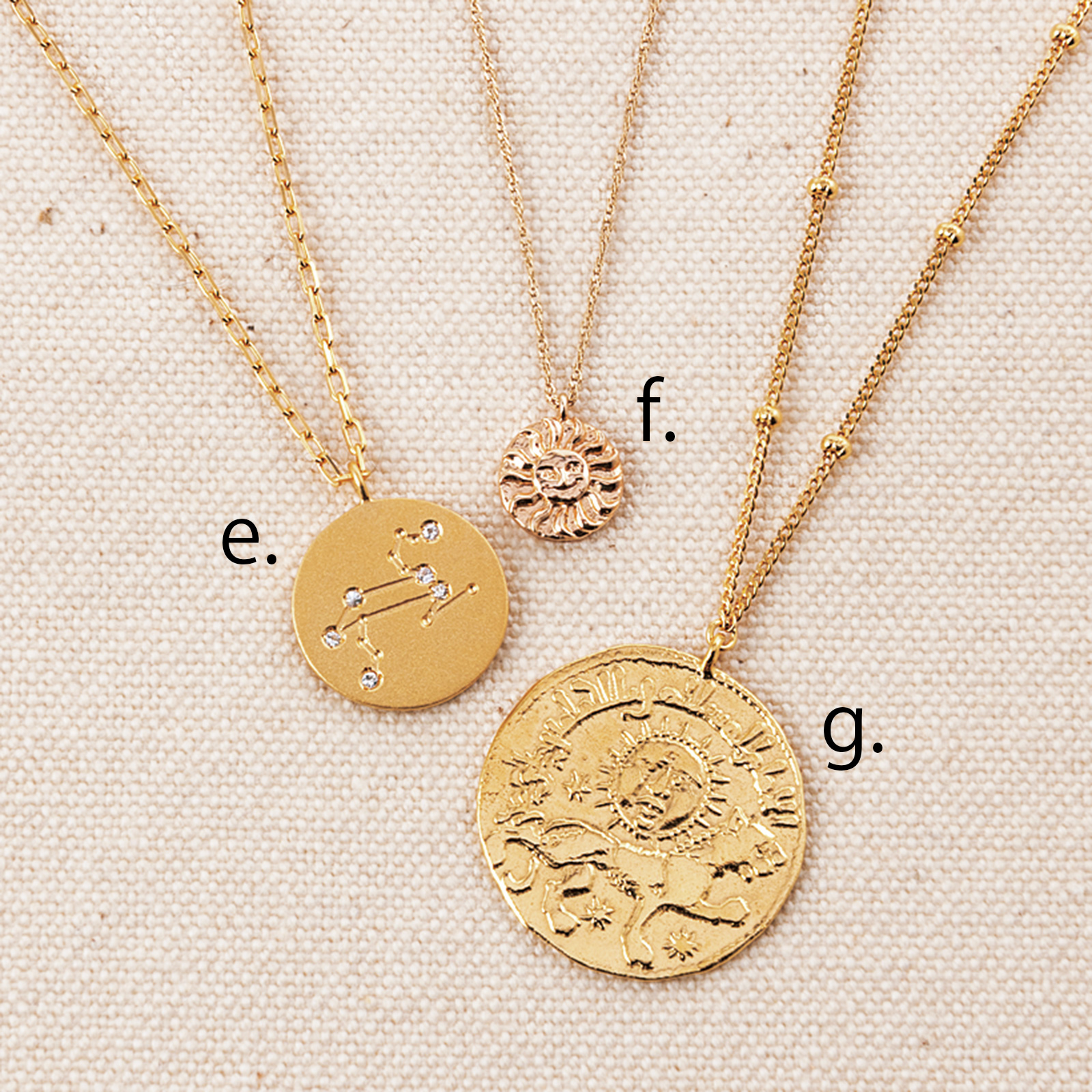 心臓の近くにヘッドがくるようにチェーンは長めのものをチョイスすると吉。大切な願いをこめて新しい出会いや学びに踏み出したい時のお守りに。e.ネックレス 獅子座¥56,100(マリハ) f.ネックレス 太陽と月¥52,800(ヴイエー ヴァンドーム青山/ヴイエー ヴァンドーム青山 有楽町マルイ店) g.ネックレス サンライオン¥26,400(マリハ)