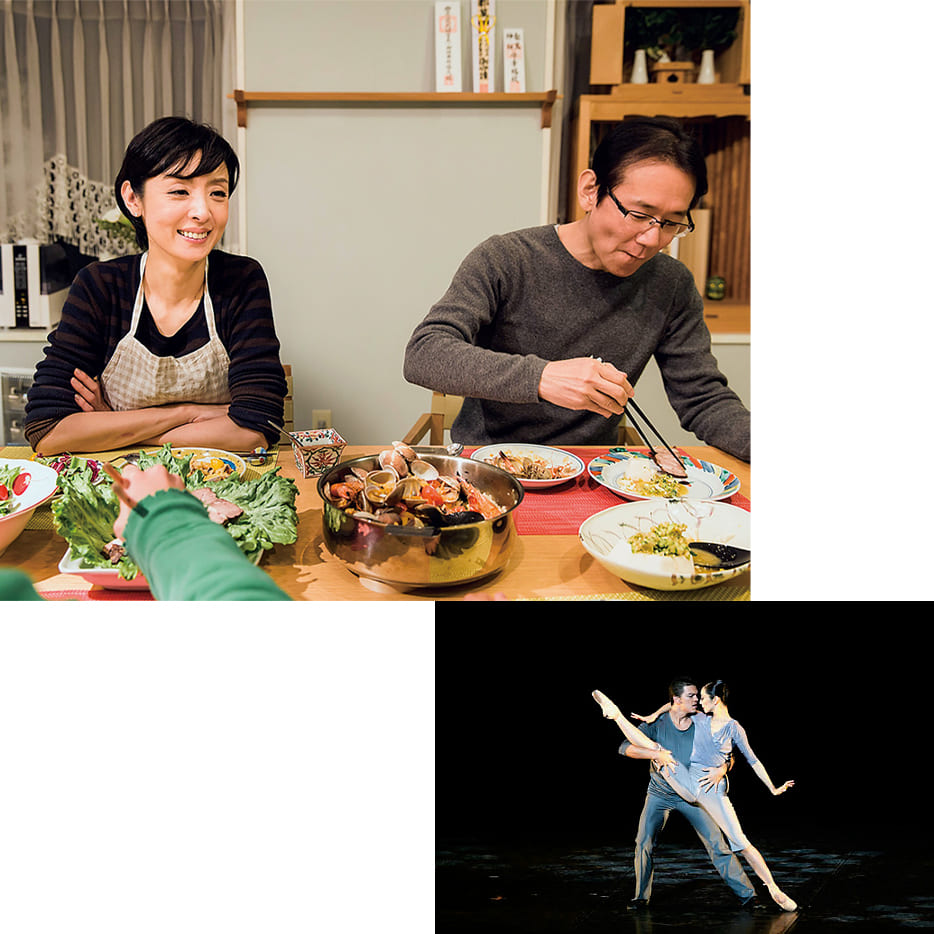 上は、自宅に甥を招いて私が料理を振る舞ったときのもの。下は引退公演の写真。俳優デビューから始まり、変革期であり転換期でもあった40代。47歳のとき、夫が監督を務めた映画『終の信託』に主演し、毎日映画コンクールで大賞を受賞。私たち夫婦にとって思い出深い作品に。