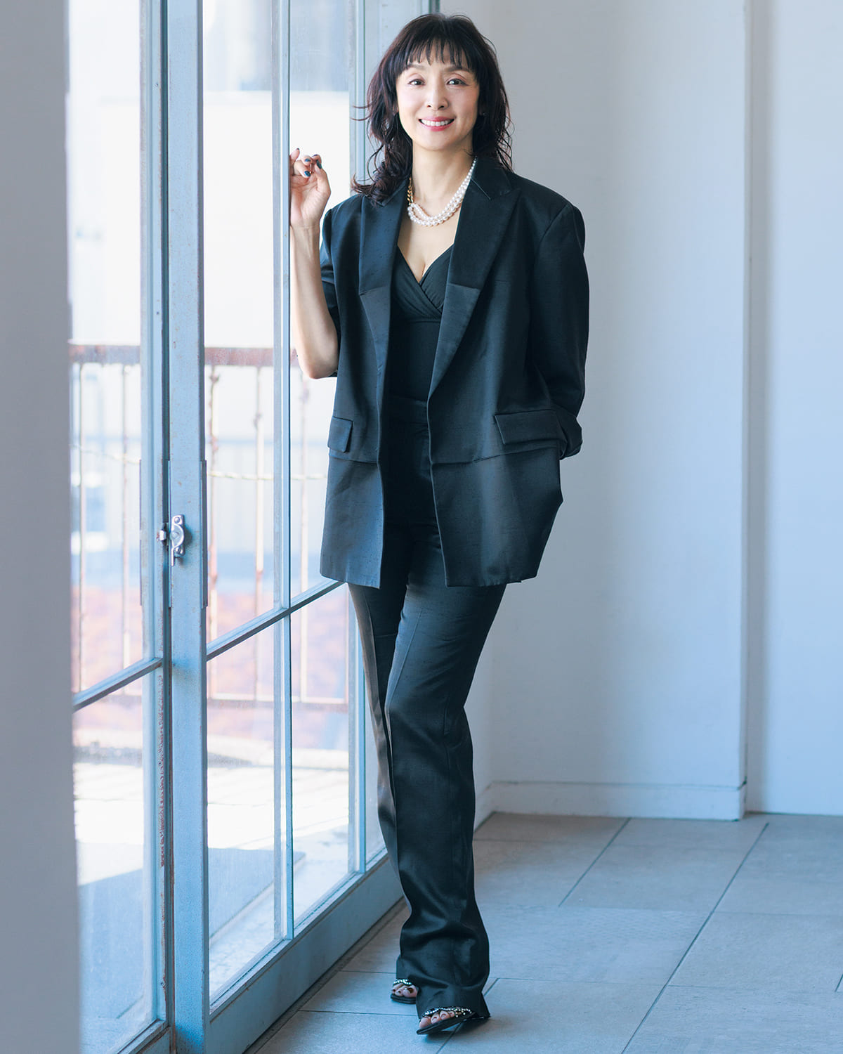 ジャケット ¥163,900、パンツ ¥104,500、パールネックレス ¥36,300(すべてN21/IZA)パンプス参考商品(セルジオ ロッシ/セルジオ ロッシ ジャパン)