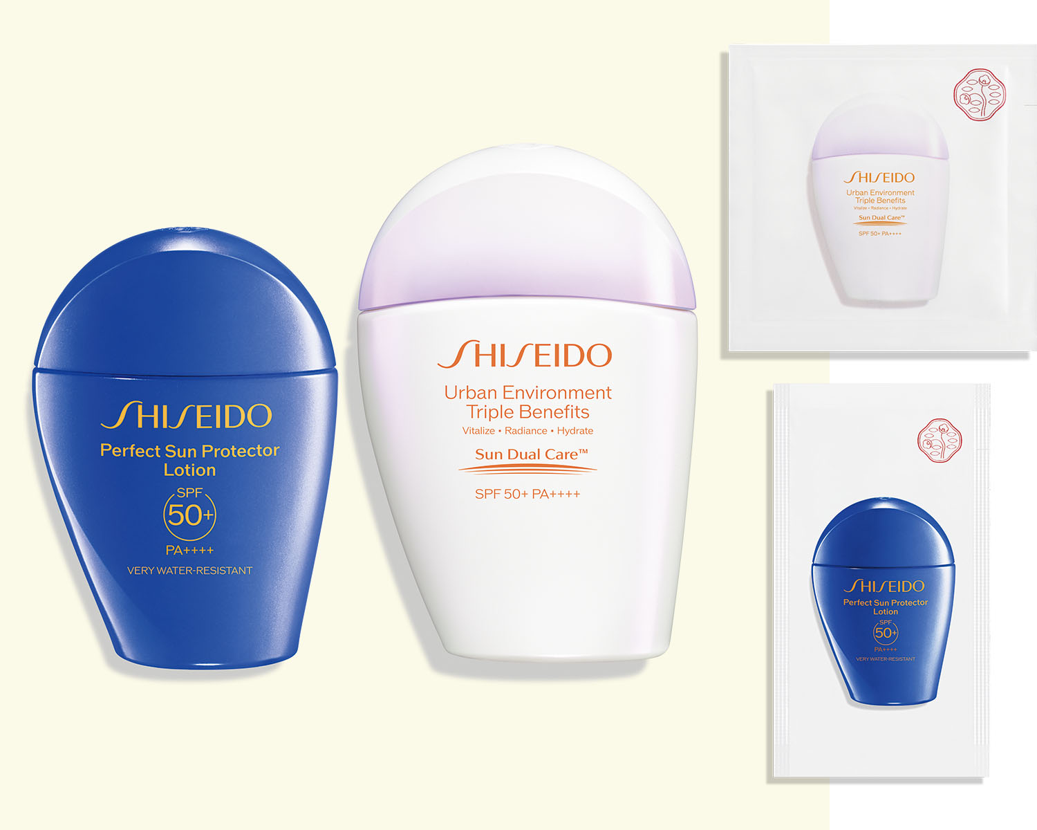 汗や熱、水分で防御膜を強化する、鉄壁のUVガード。左から:SHISEIDO パーフェクト サン プロテクター ローション SPF50+・PA++++ 2ml パウチ1包、SHISEIDO アーバン トリプル ビューティ サンケア エマルジョン SPF50+・PA++++ 2ml パウチ1包