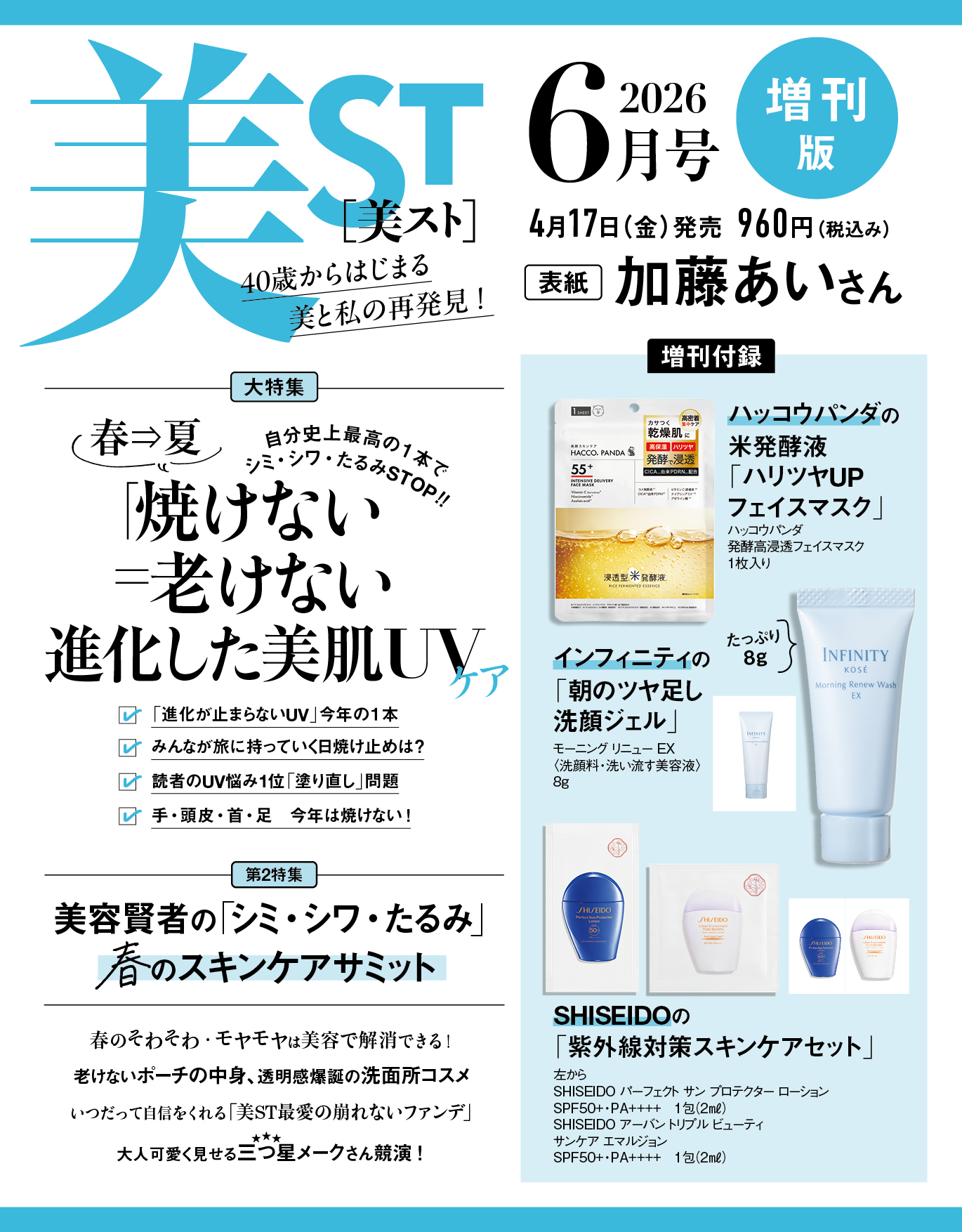 4月17日(金)発売・美ST2026年6月号のネット書店予約がスタートしました!加藤あいさん&本田響矢さんが表紙を飾ります。本田響矢さんは美ST初表紙です!本誌付録はKANEBOの化粧水+朝クリーム&ファンデの名品セット。増刊と特別版にはSHISEIDOの紫外線対策スキンケアセット。さらに増刊にはハッコウパンダのフェイスマスクとインフィニティの洗顔ジェル。特別版には銀座ハリッチのハリ育成極上セットが付録につきます。ぜひお早めにご予約ください!