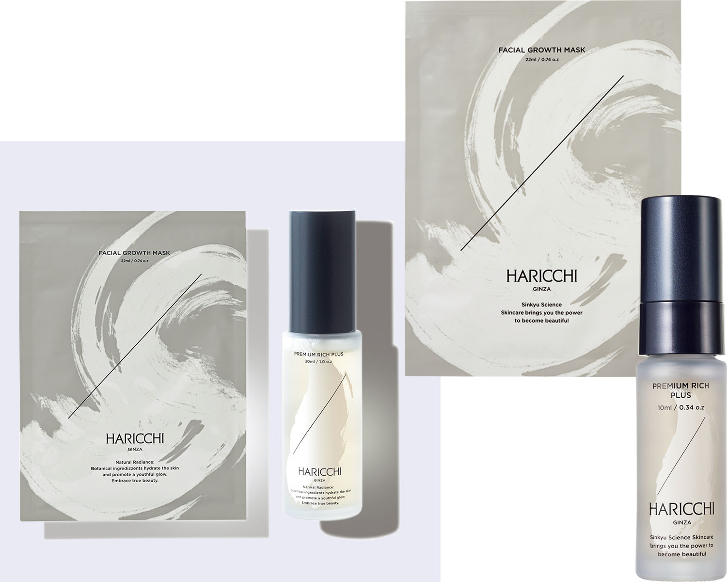 巡らせる鍼灸サイエンスに基づいたケアを。左から:ハリッチ フェイシャルグロースマスク、ハリッチ プレミアムリッチプラス(根幹美容液)10ml ミニボトル